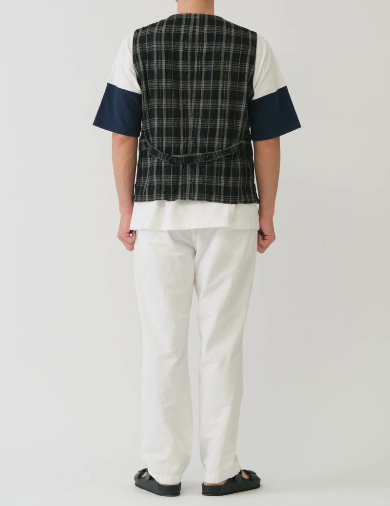 ライトウェイトに仕上げるため、縫代は全てパイピングテープで処理しテープカラーは生成りでアクセントにしている。