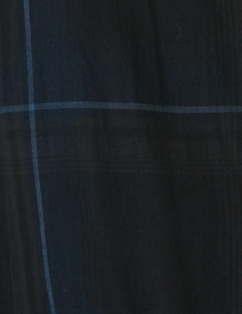 表地はオーガニックコットンを使用したサスティナブル素材で、ダークトーンのマドラスチェック柄に顔料を両面コーティング後、ワッシャー加工する事で、うっすらと柄が浮き出てくる素材。