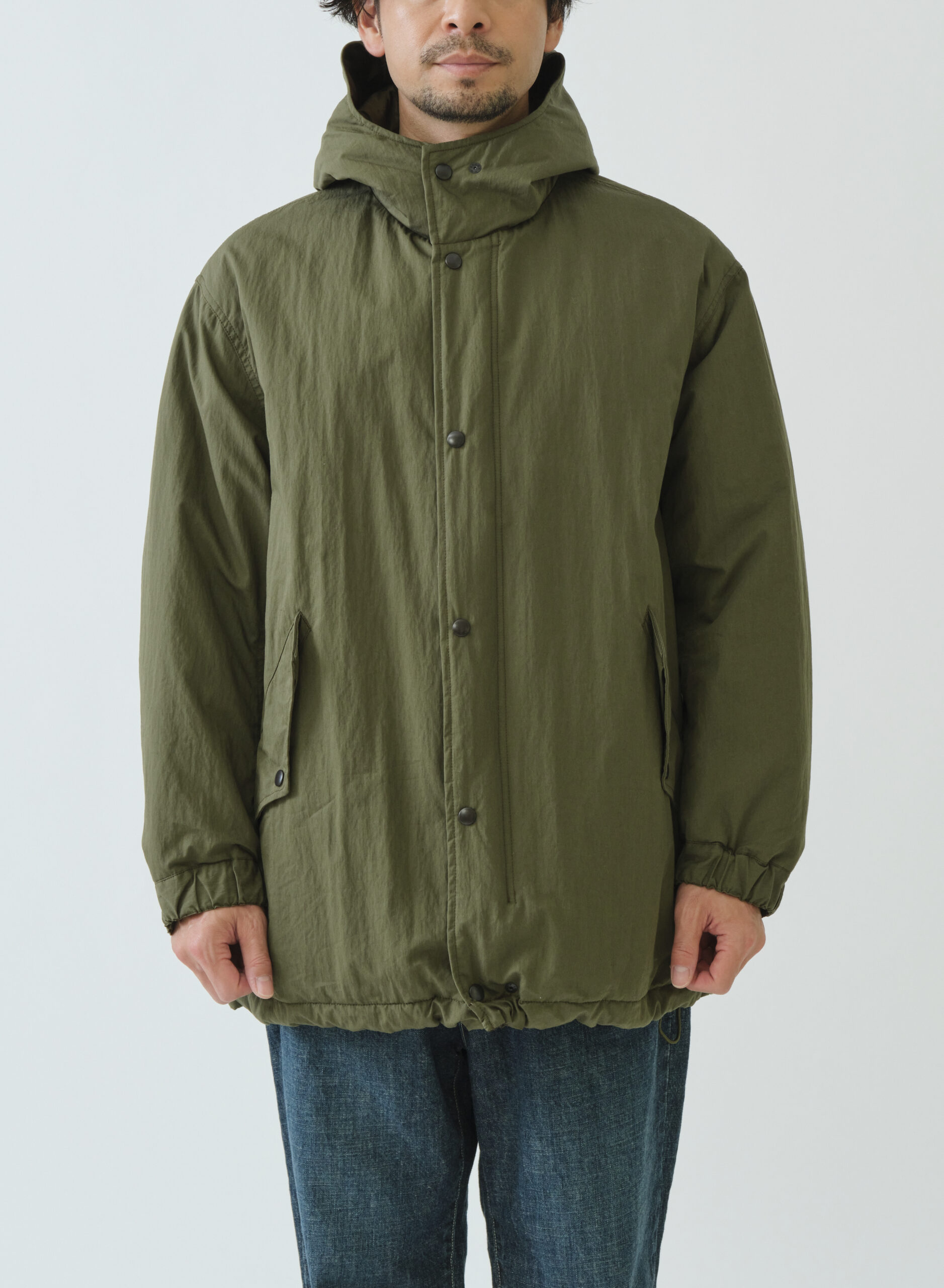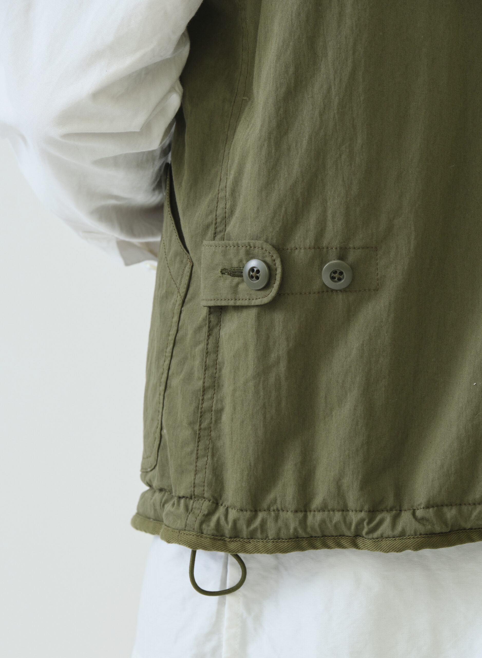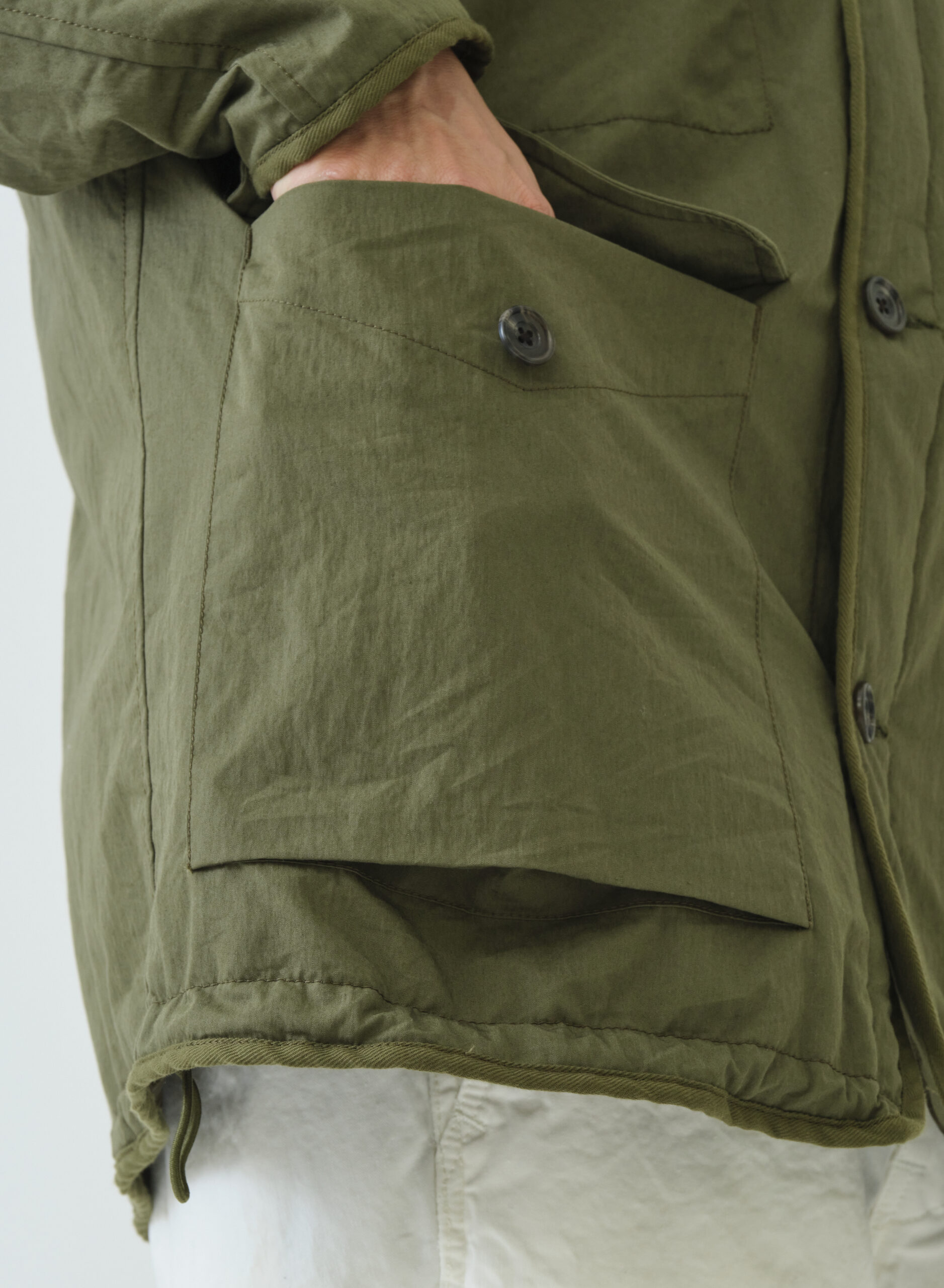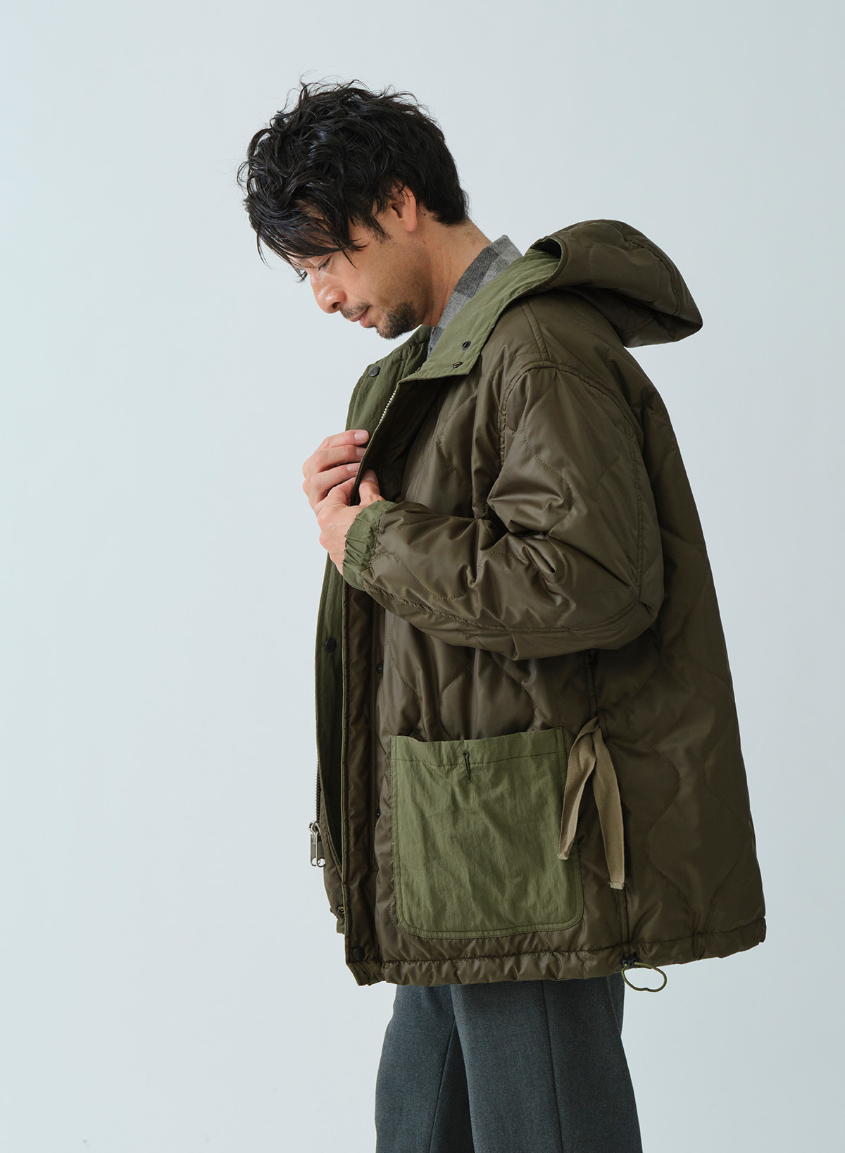 ミリタリーテイスト感漂うM51タイプパーカー。ドロップショルダーでたっぷりとしたボリューム感を持たせたシルエット。表側はフラップ付きポケットで無骨なワークポケットが外観に力強さを与える一方、裏側の大ぶりなパッチポケットはキルティングの柔らかさと調和。内側のウエストテープと裾のエラスティックコードで、見た目の印象を自在に調整できます。ポケットの意匠も機能も表裏で対照的に作り分けた、表情豊かなリバーシブルパーカーです。