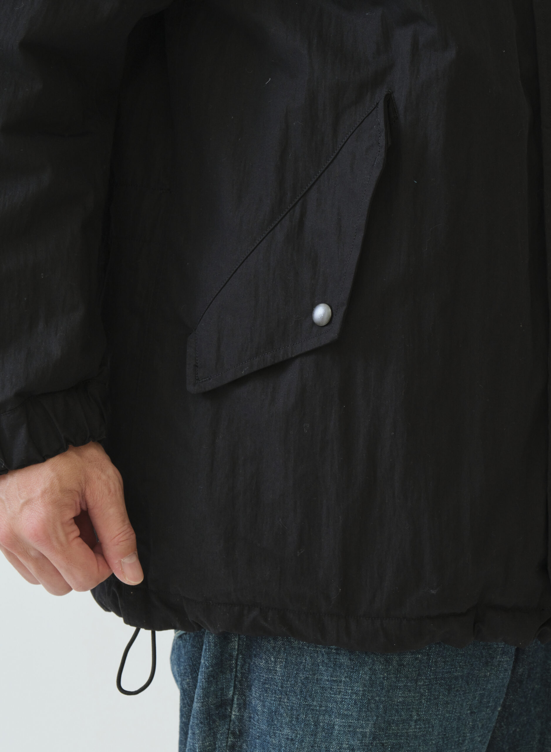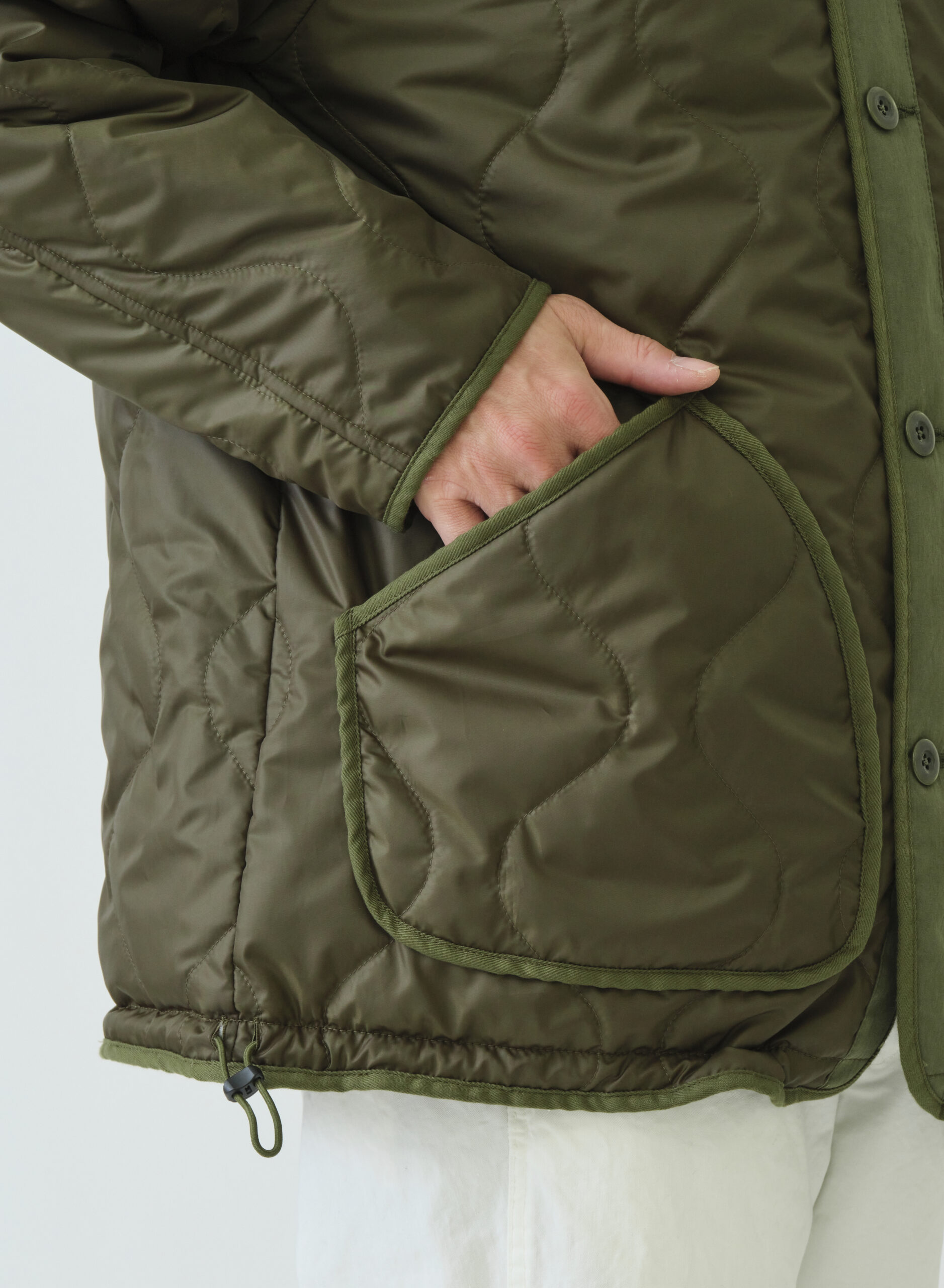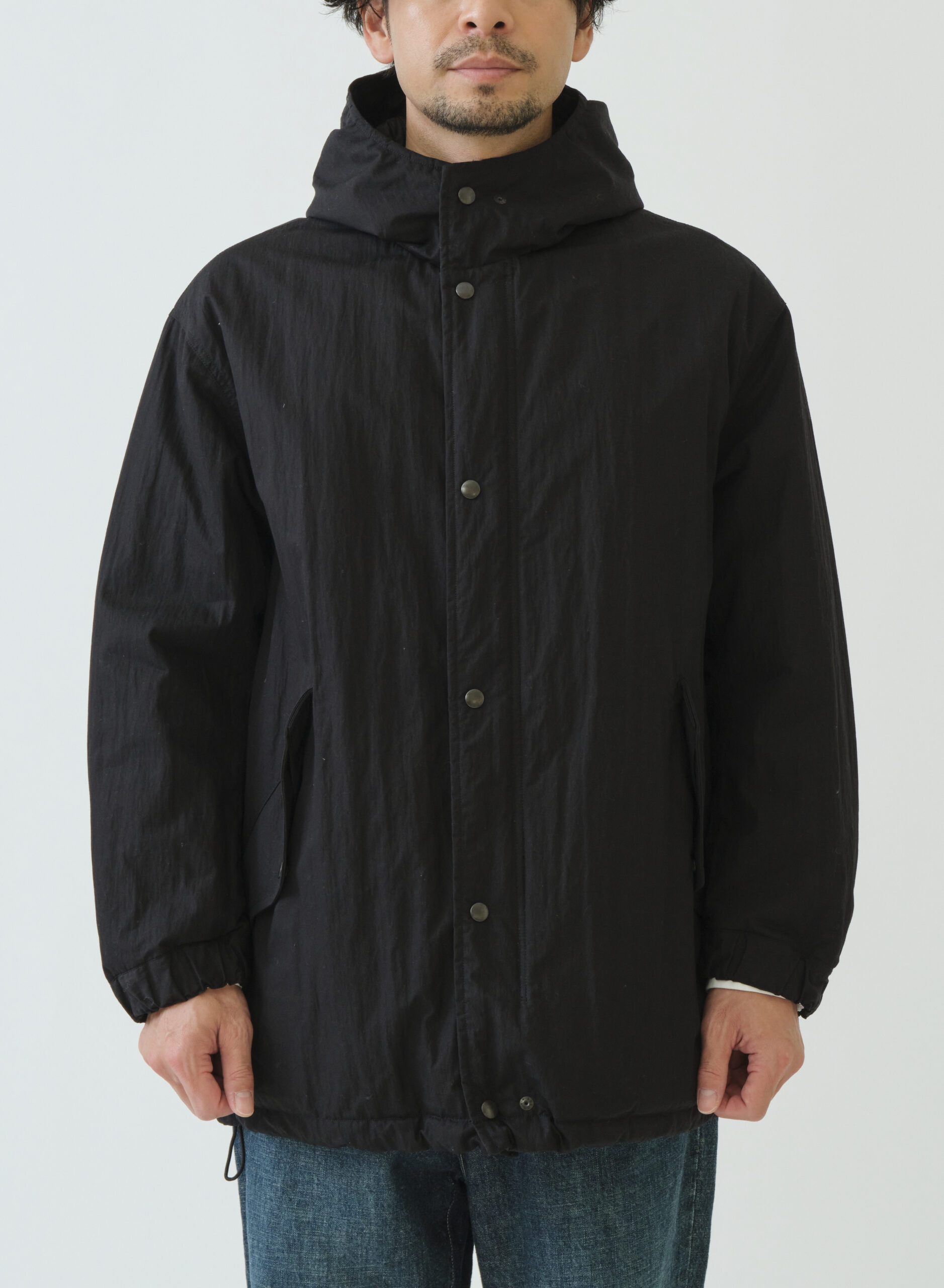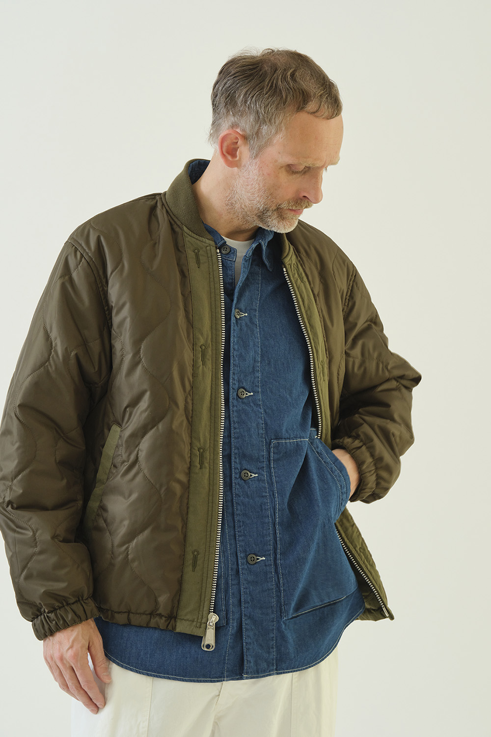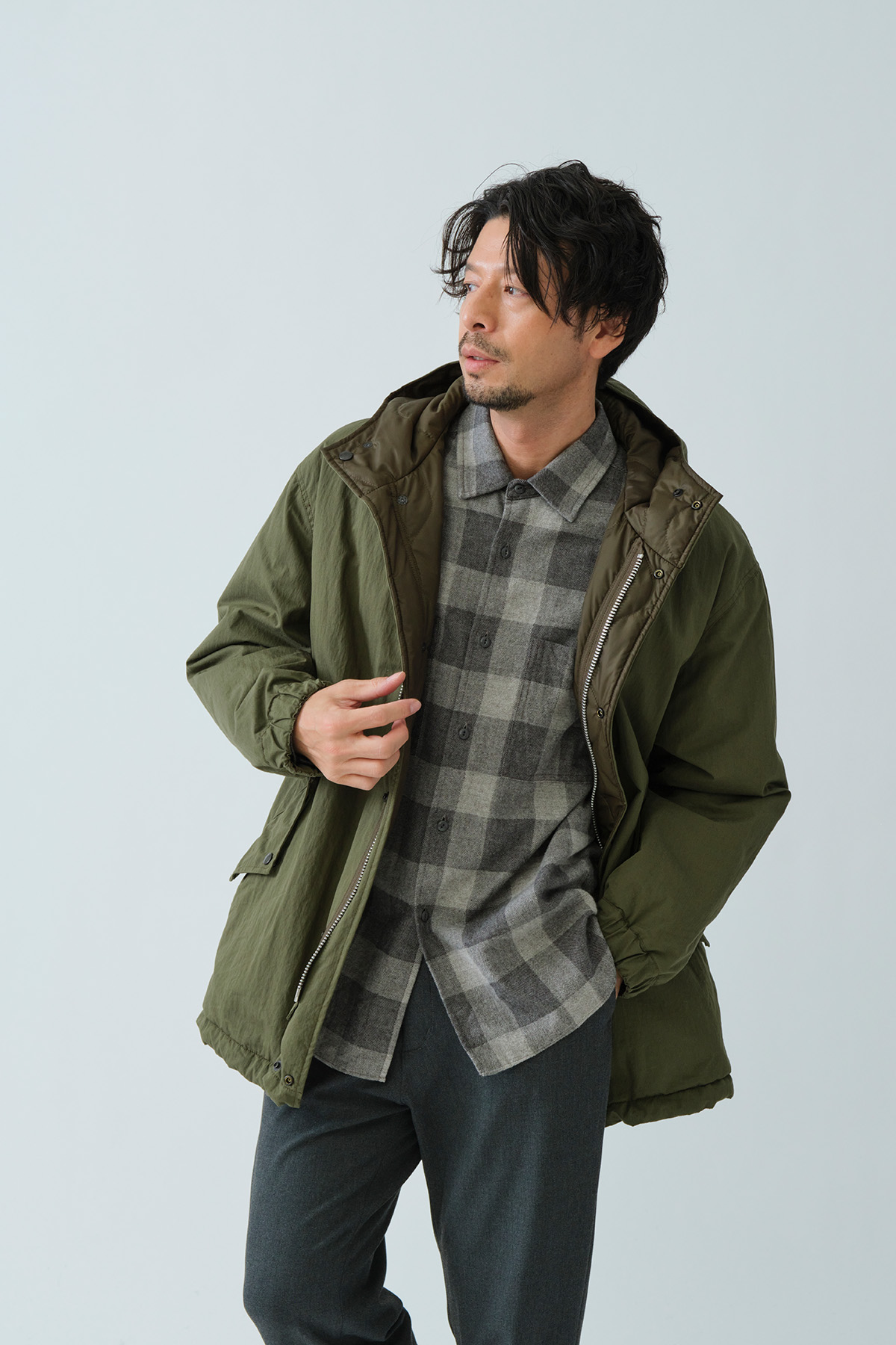 ミリタリーテイスト感漂うM51タイプパーカー。ドロップショルダーでたっぷりとしたボリューム感を持たせたシルエット。表側はフラップ付きポケットで無骨なワークポケットが外観に力強さを与える一方、裏側の大ぶりなパッチポケットはキルティングの柔らかさと調和。内側のウエストテープと裾のエラスティックコードで、見た目の印象を自在に調整できます。ポケットの意匠も機能も表裏で対照的に作り分けた、表情豊かなリバーシブルパーカーです。