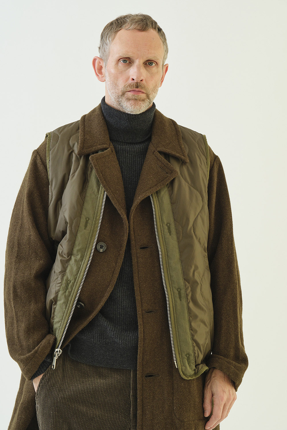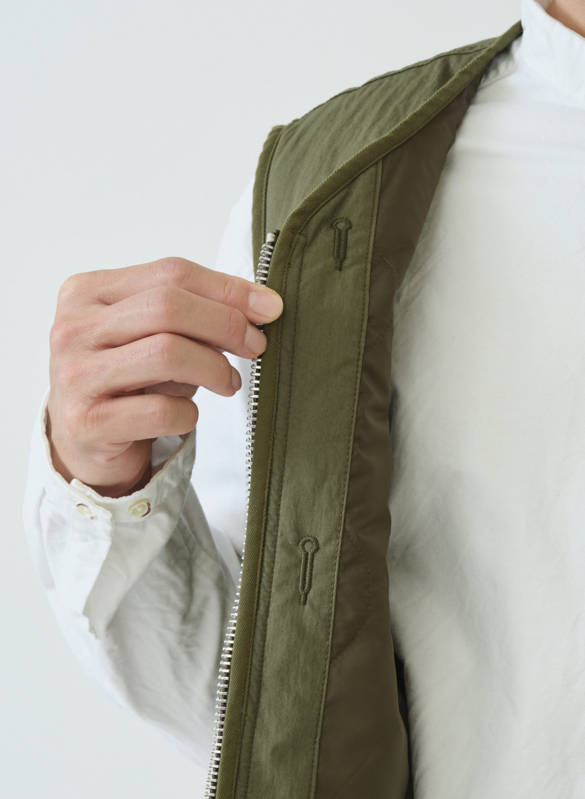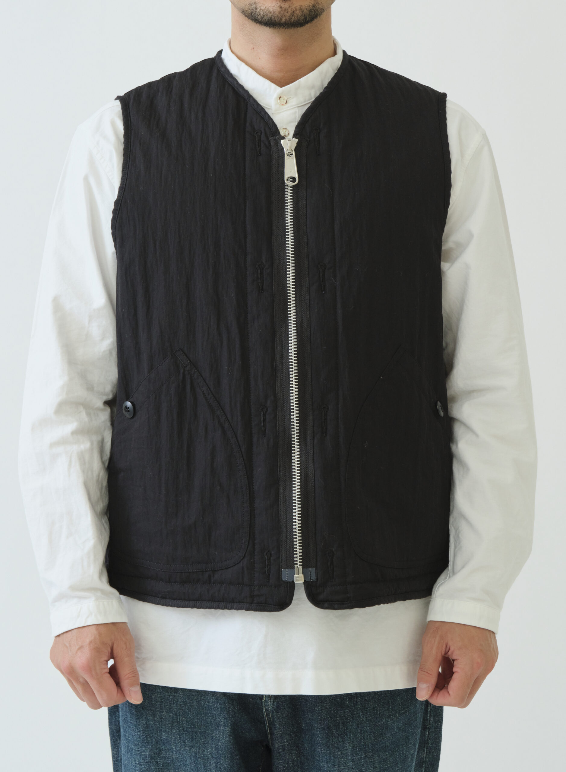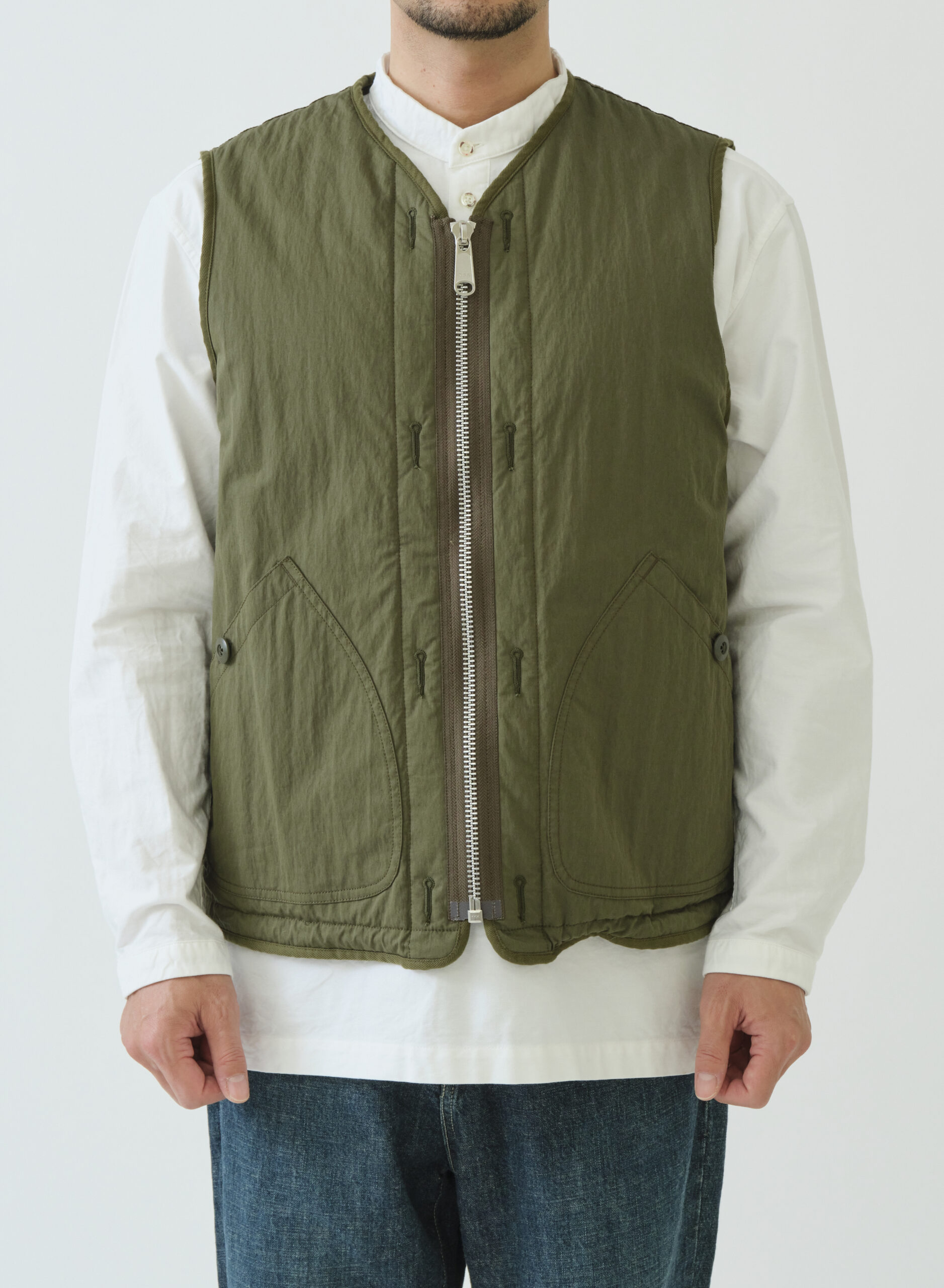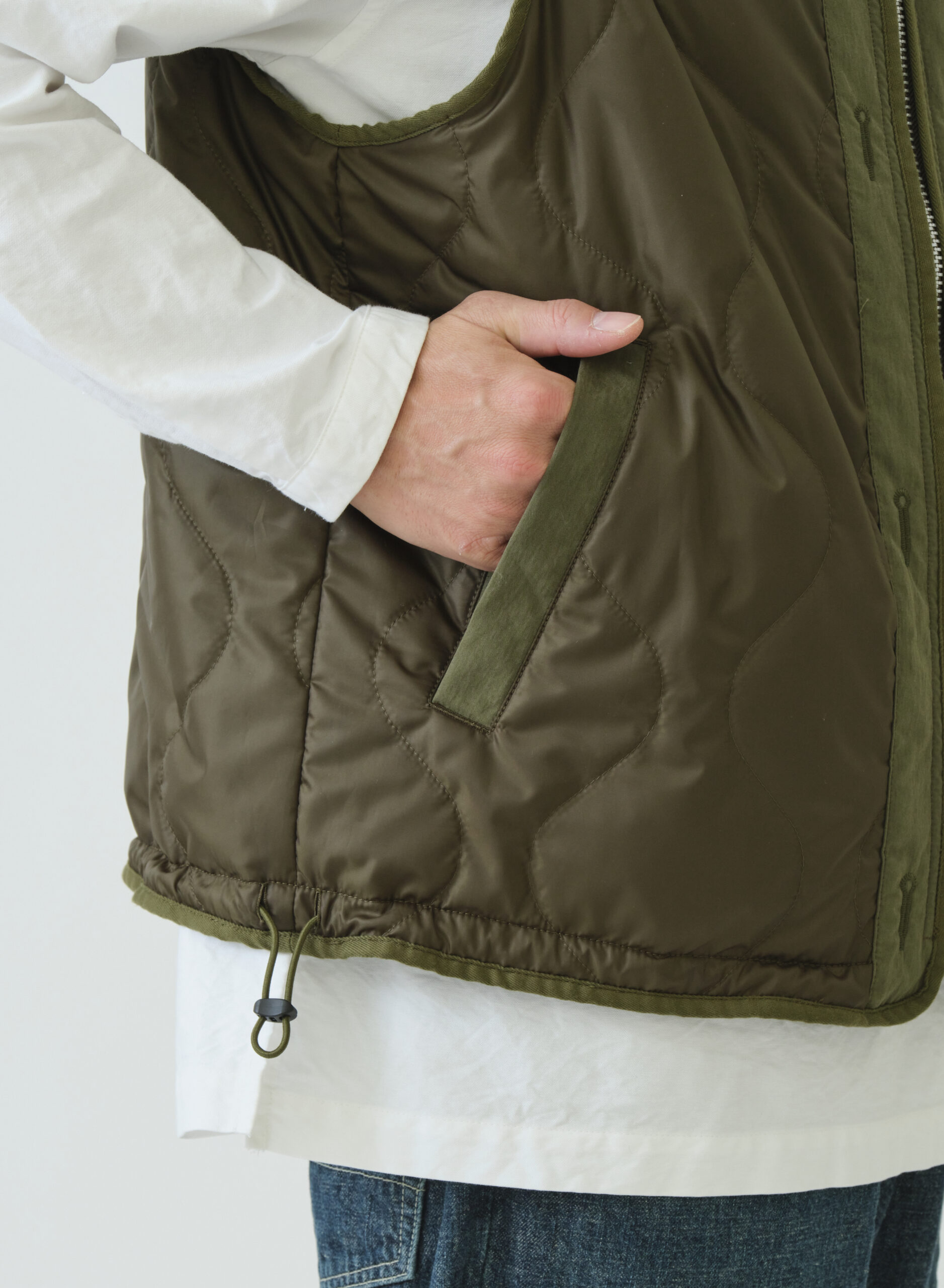 ライナーベストをベースにしたデザインのリバーシブルライナーベスト。縫代は全てパイピングテープ仕上げ。内側のウエストタブと裾のエラスティックコードでフィット感を調整でき、レイヤード時の動きやすさと保温性を確保します。表側はワークテイストのポケットがアクセントとなるマットな顔立ち、裏側は片玉ポケットが付きキルティングの柔らかな光沢で上質な暖かさを演出します。