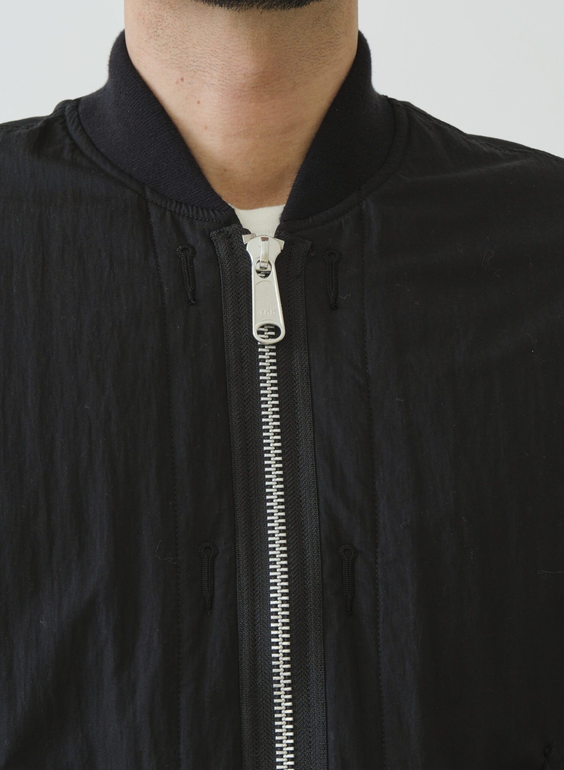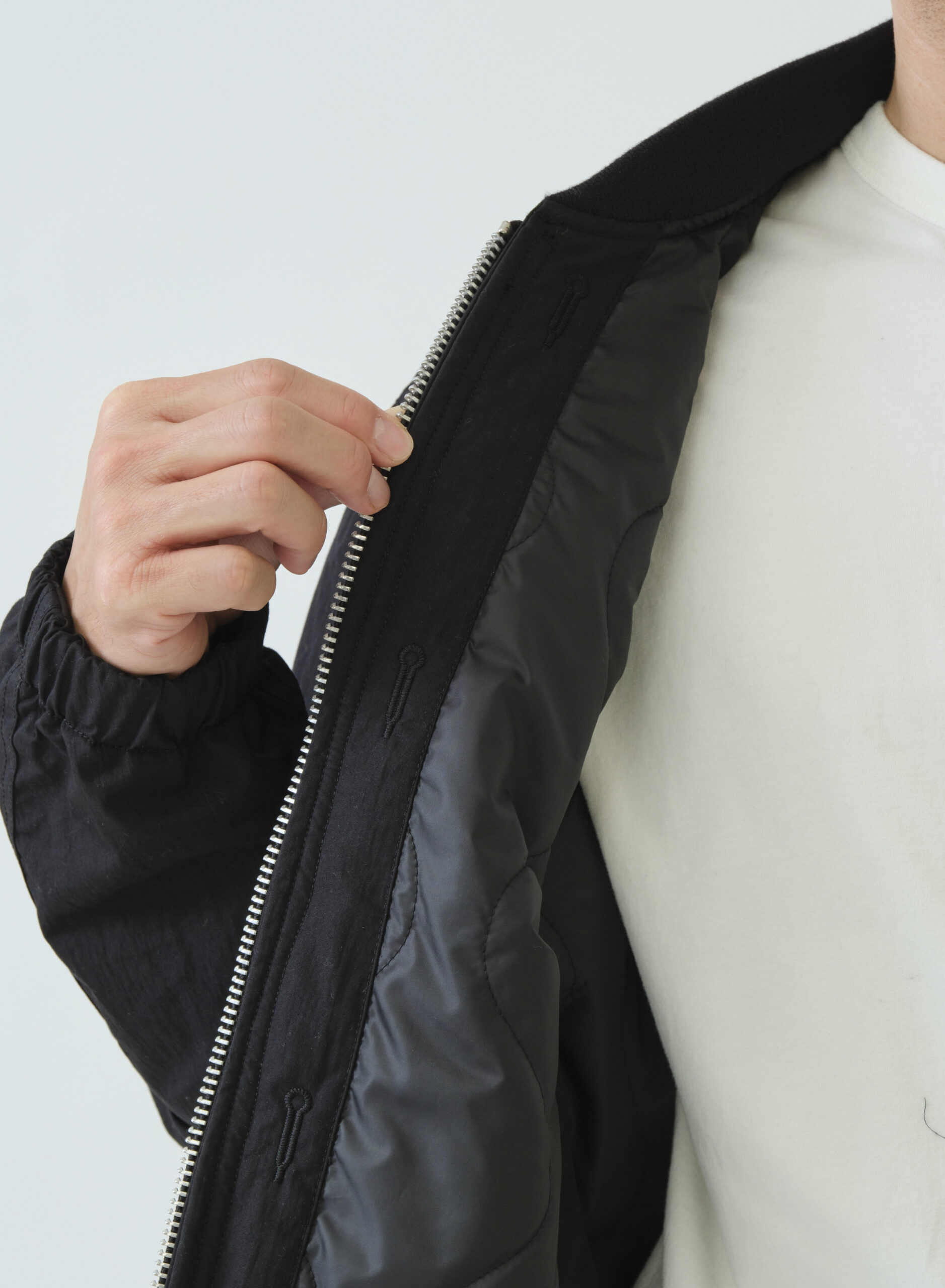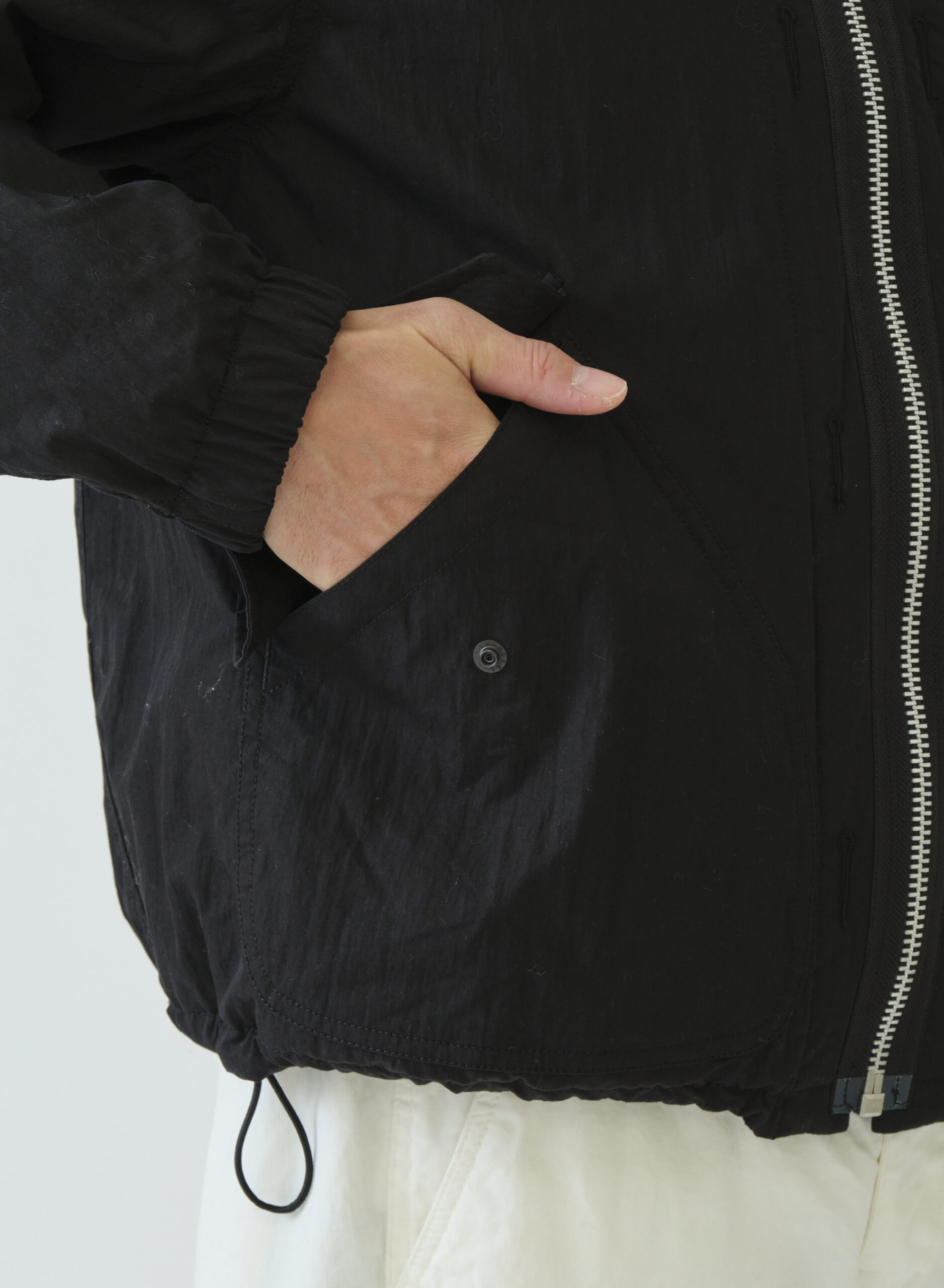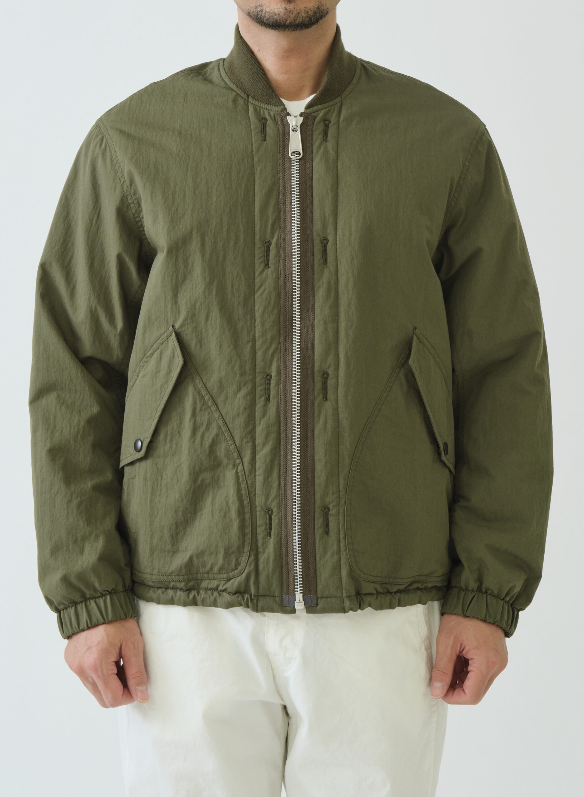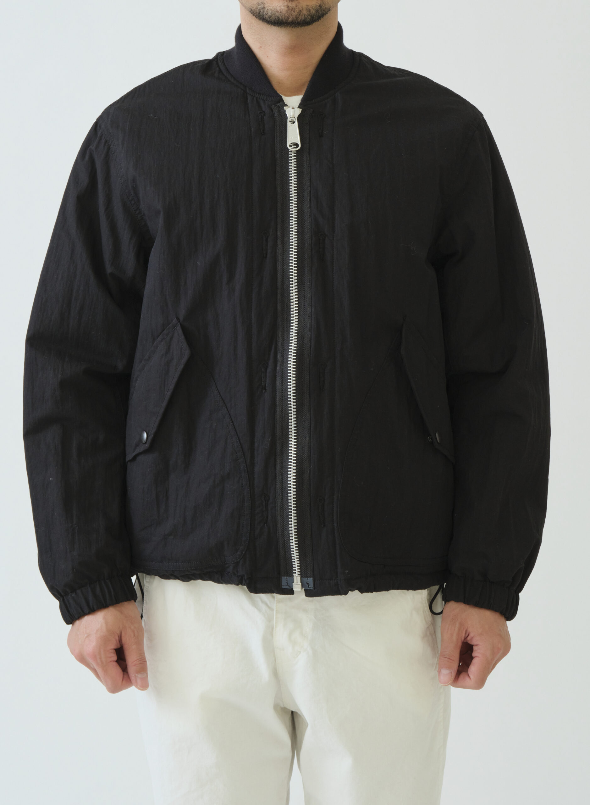 ボックスボディーでオーバーサイズのリバーシブルMA-1タイプジャケット。MA-1の特徴でもあるリブは衿のみに使用してミニマルに整え、袖口にはゴム、裾にはエラステックコードを引っ張ることで細かくサイズ調整が可能です。表側はミリタリーテイストのパッチ&フラップポケット、裏側はシンプルな片玉ポケットを備え、どちらの面も主役になる一着です。