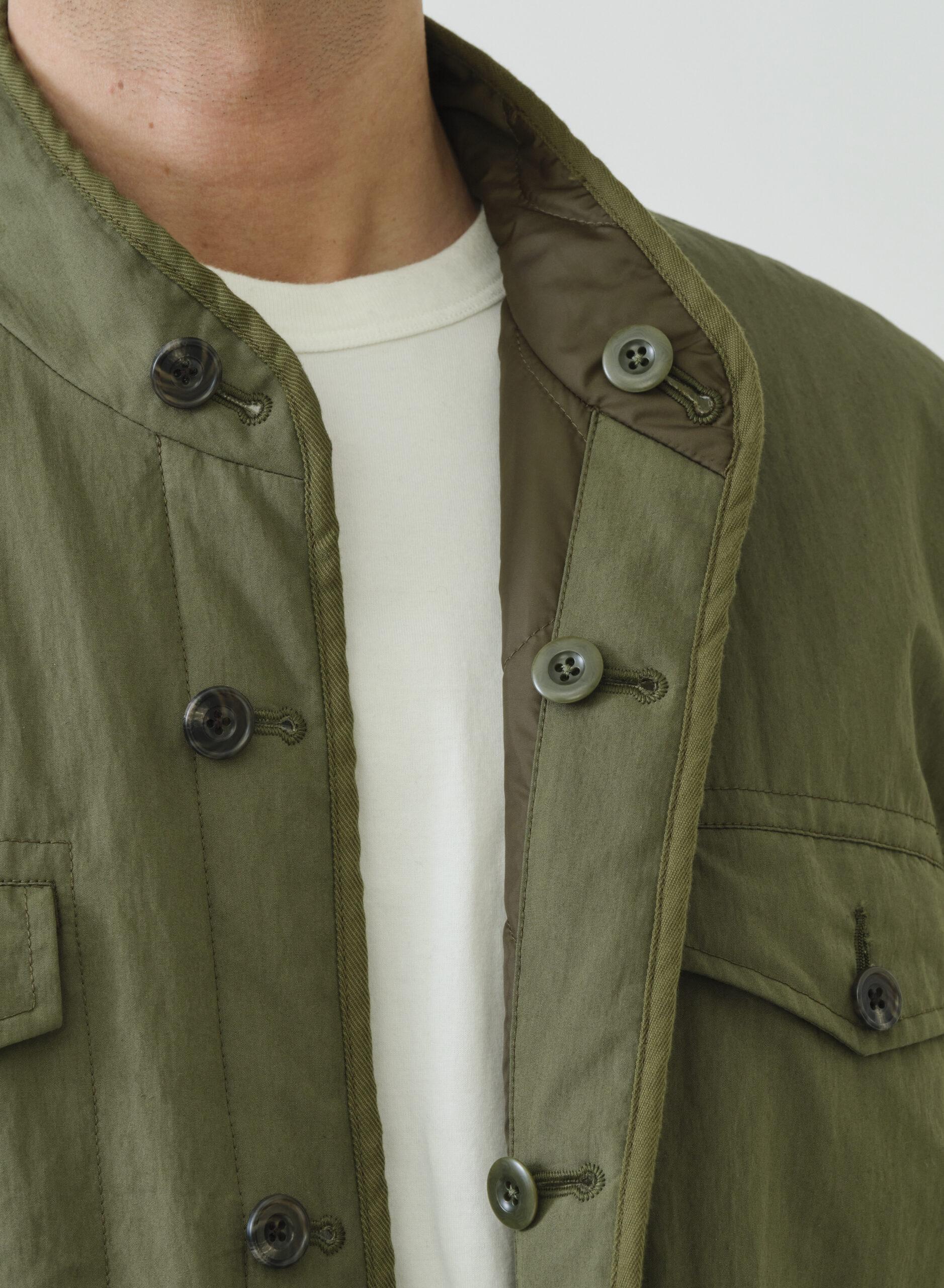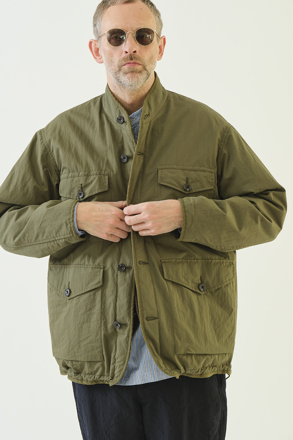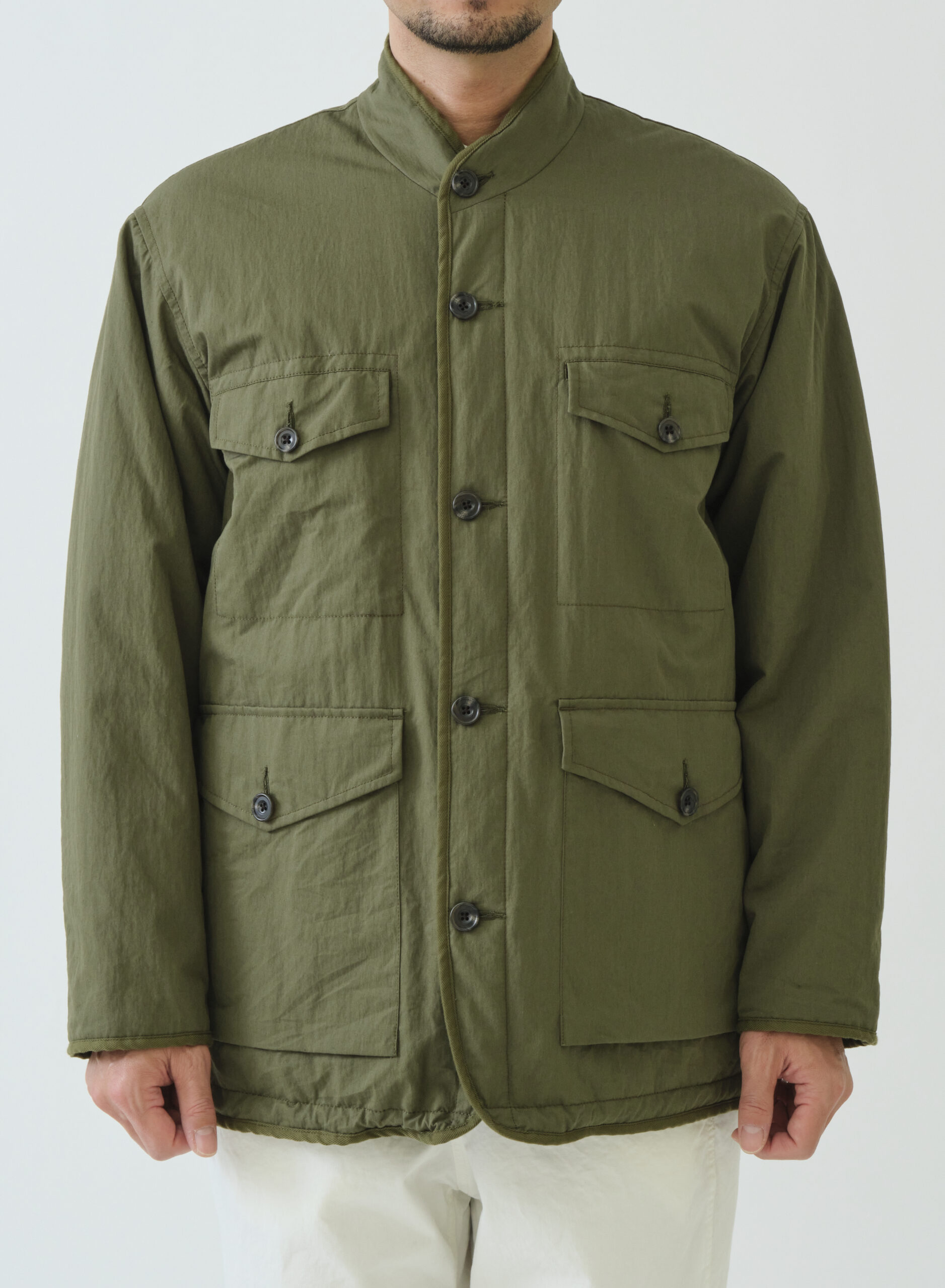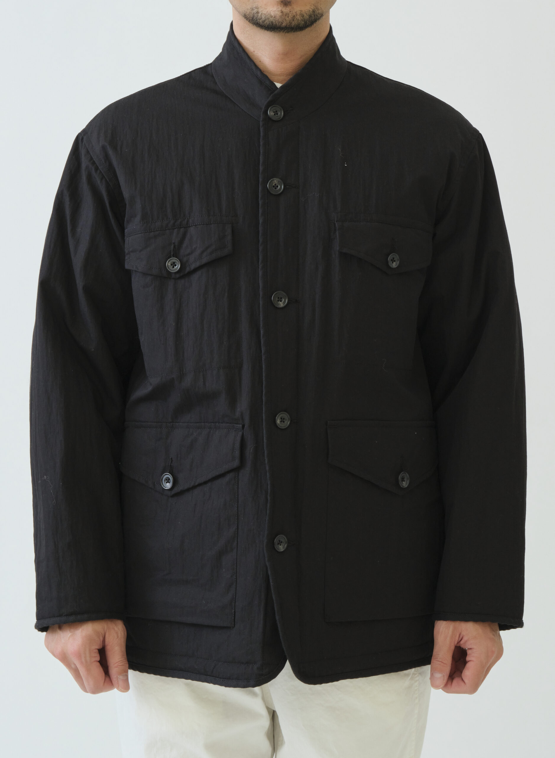 ゆったりボディーでボックスシルエットのマオカラージャケット。縫い代はすべてパイピングテープで仕上げ、クラシックな佇まいを演出します。裾にはエラスティックコードを内蔵しているため、シルエットの微調整が可能。表側はワークテイストのポケットで力強さを、裏側はシンプルなパッチポケットで2つの表情を楽しめるリバーシブル仕様です。