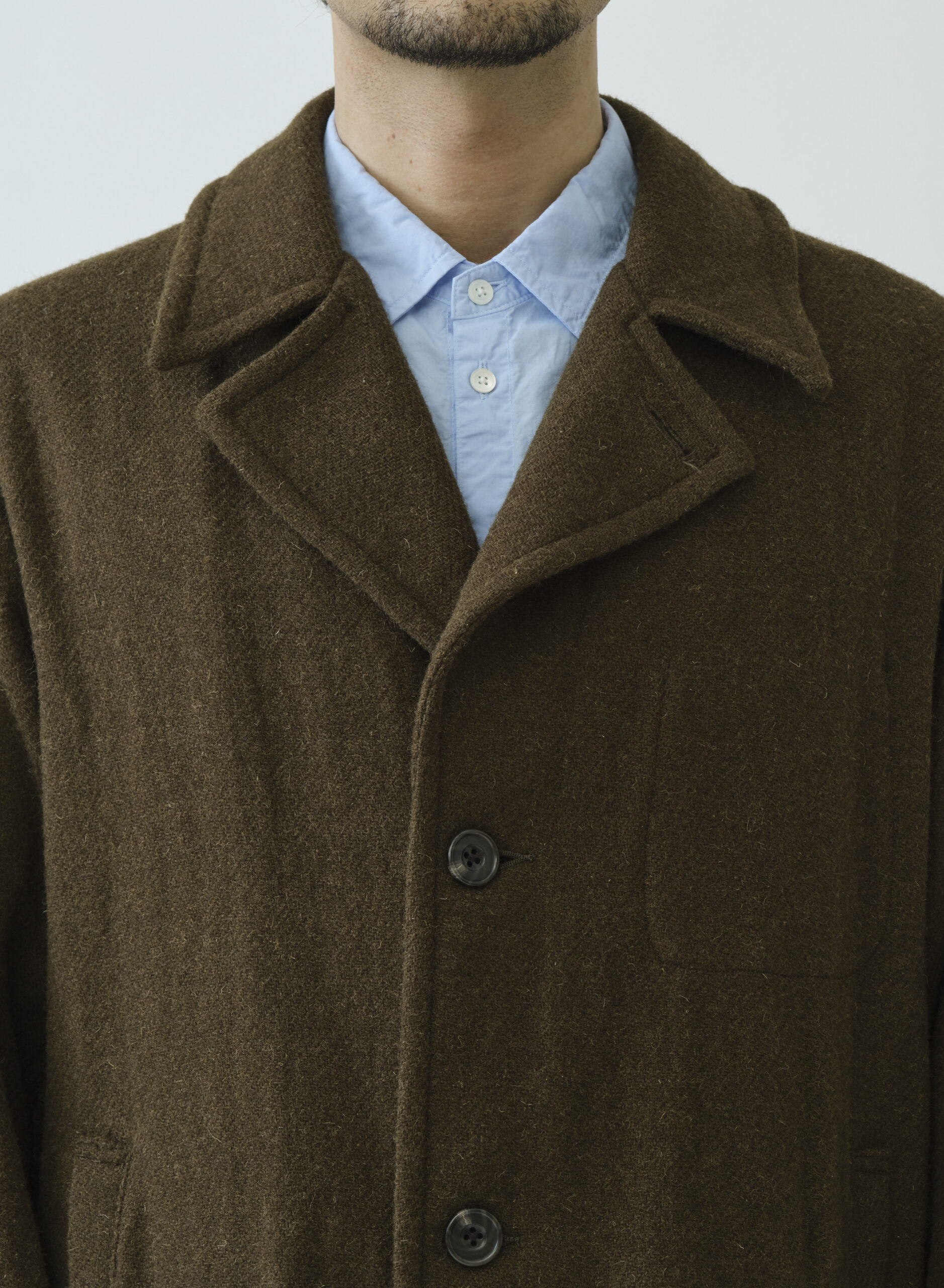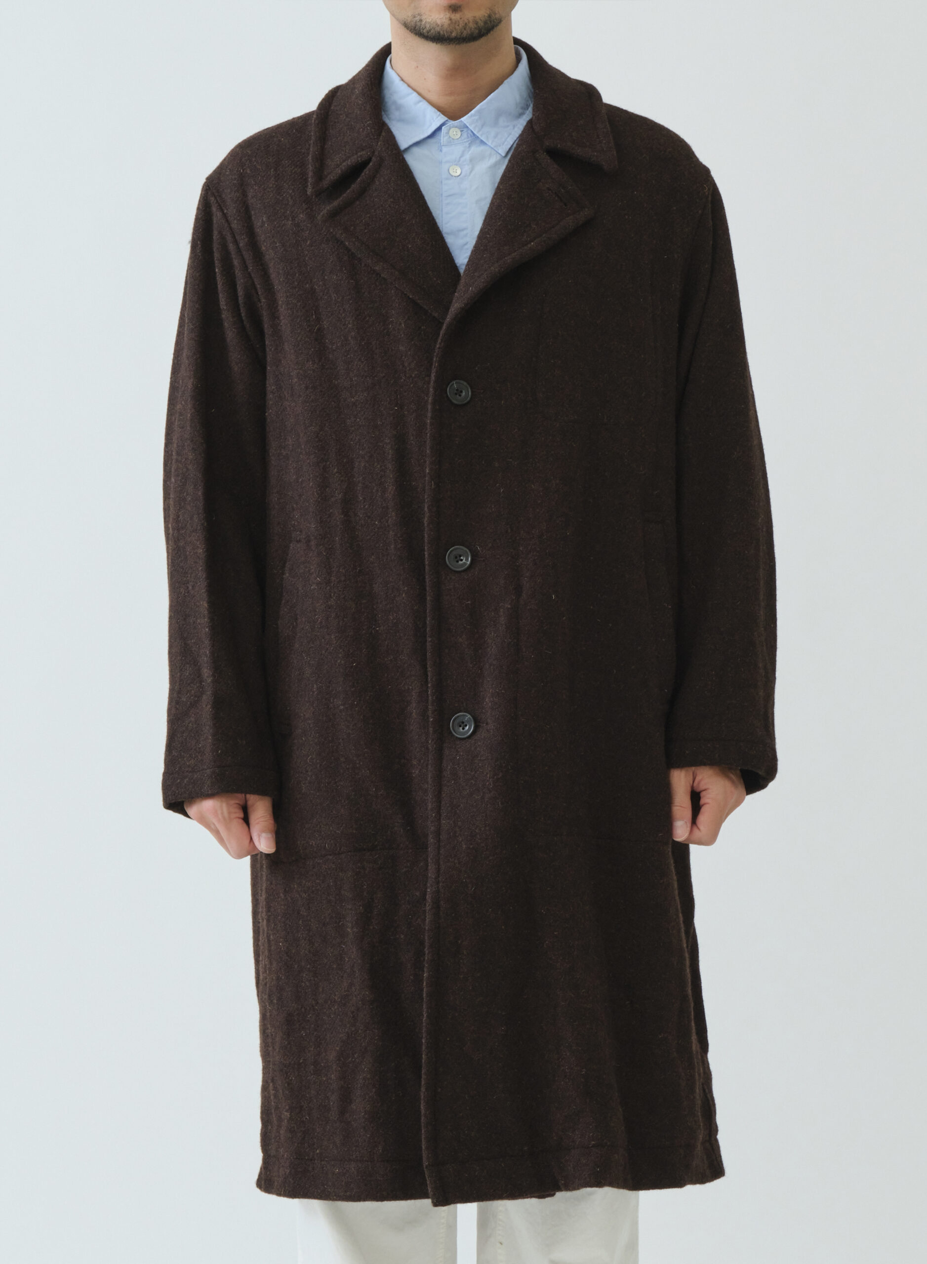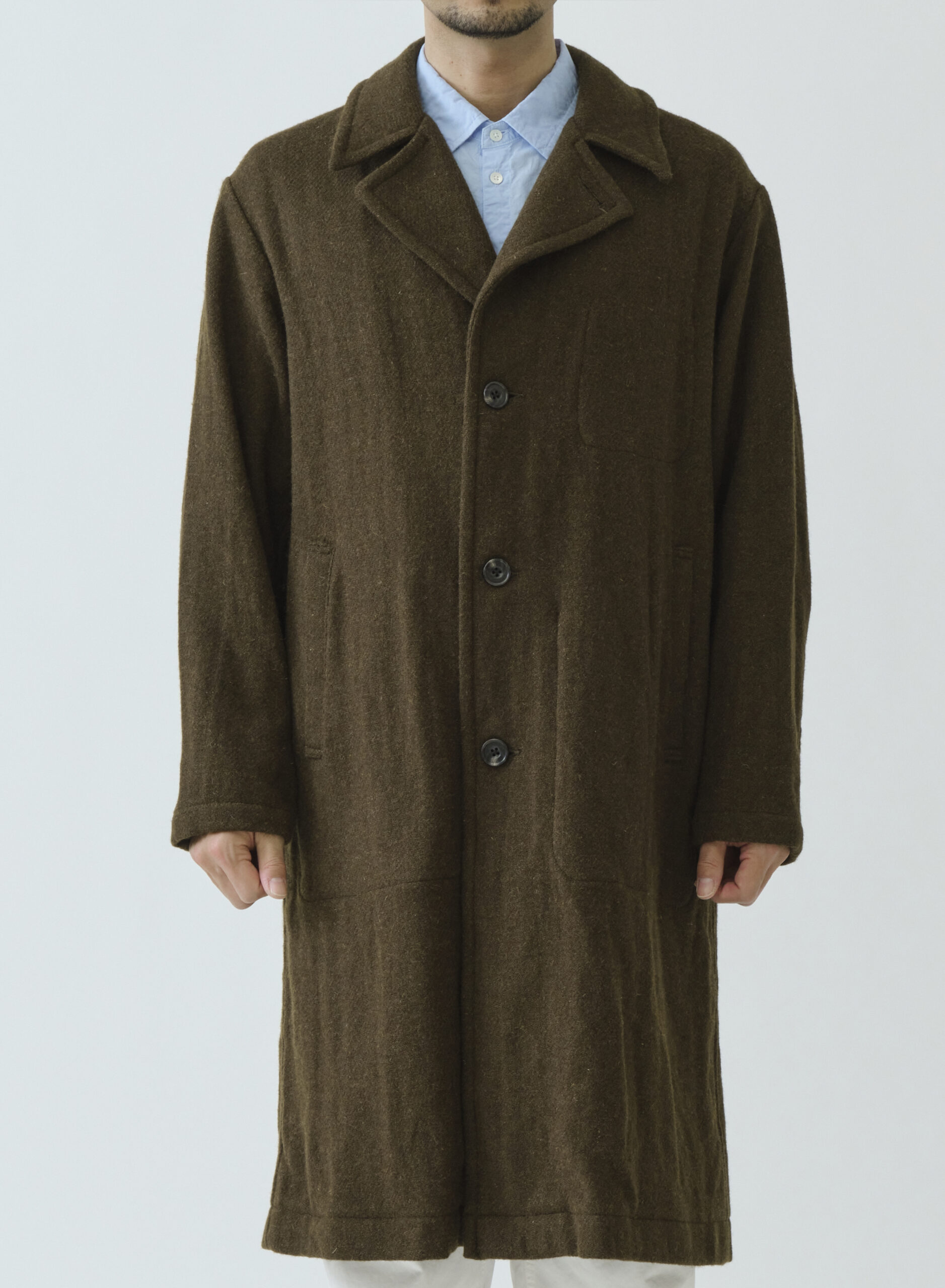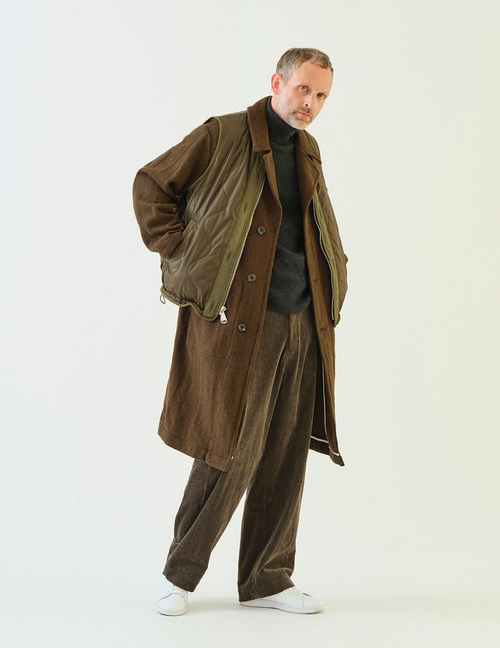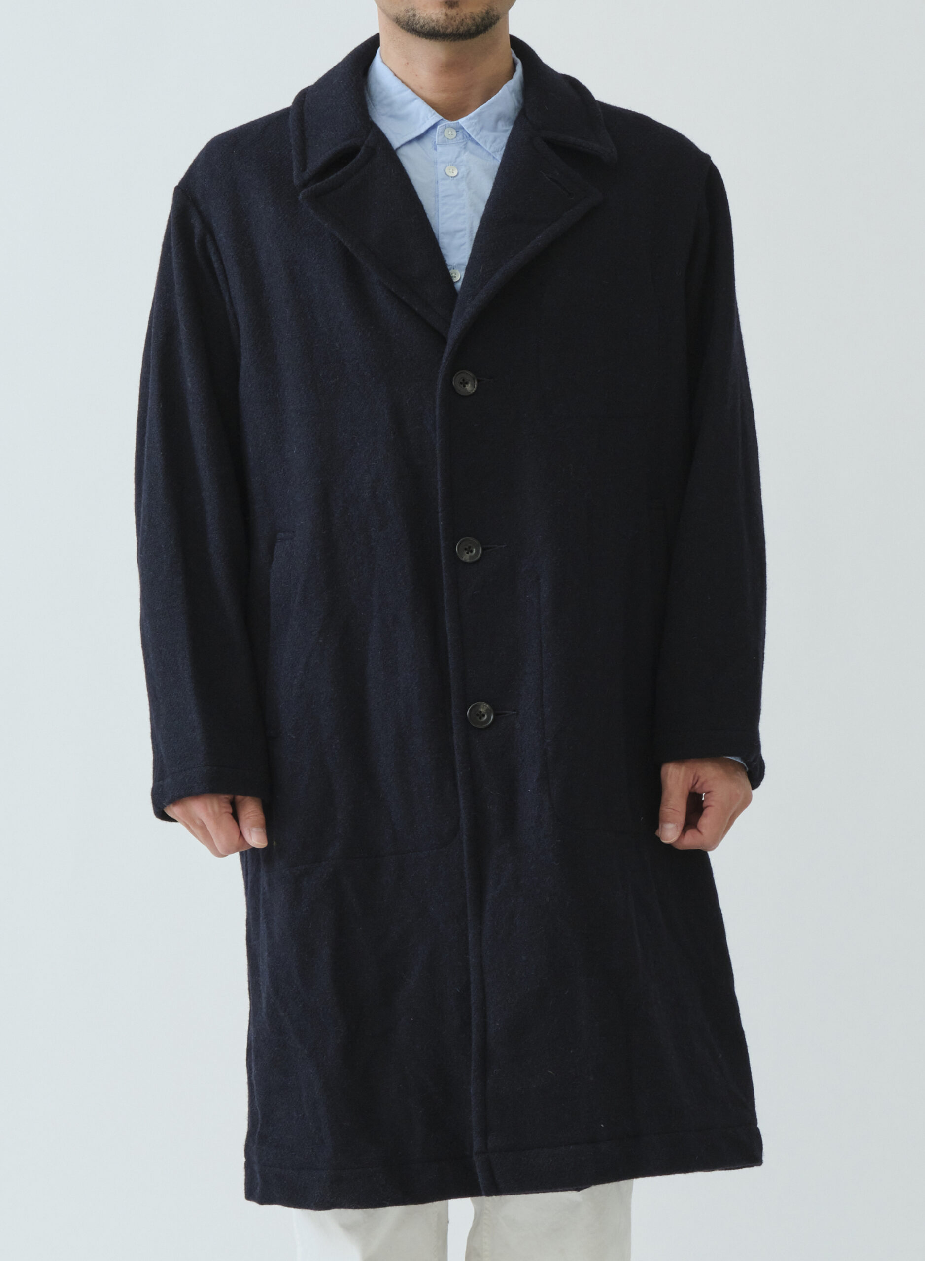コンフォート感漂うオーバーサイズのアルスターカラーロングコート。首元をすっきり見せつつ、クラシックな佇まいを与える襟元はコート全体の印象を引き締めます。表側のシンプルな腰ポケットは貫通スリット仕様。内側のパッチポケットと連動して使えるため、スマートフォンや財布などを分けて収納でき、機能性に優れています。ライトウェイトに仕上げるため、すべての縫い代をパイピングテープで処理。パイピングの生成りカラーがさりげないアクセントになっています。