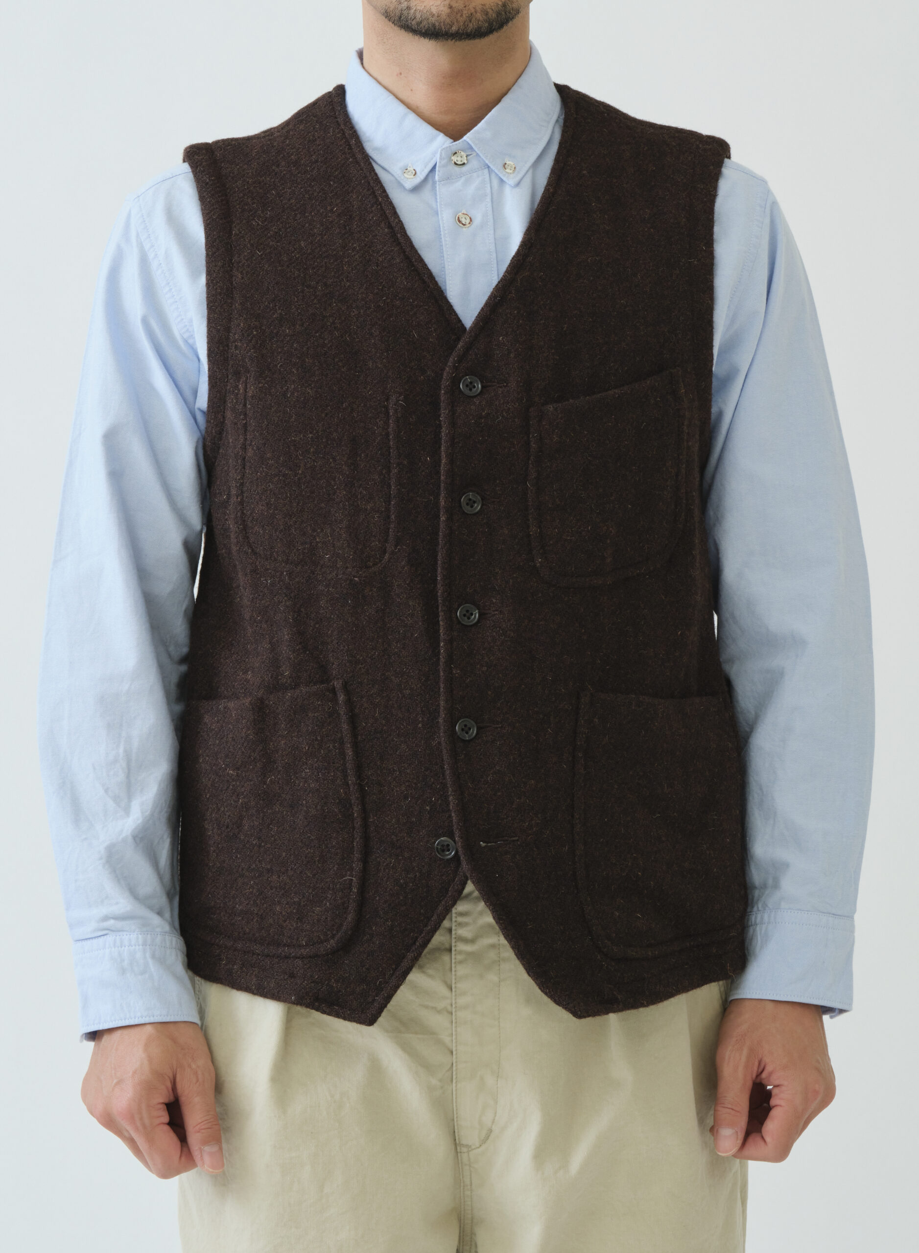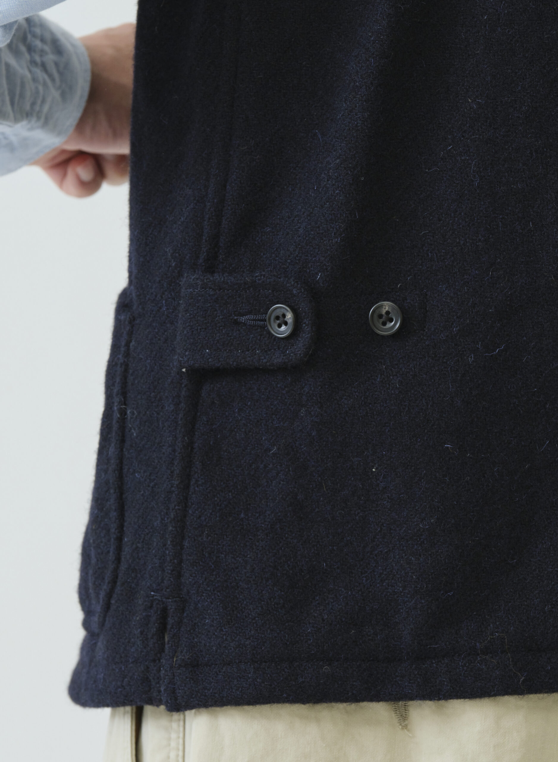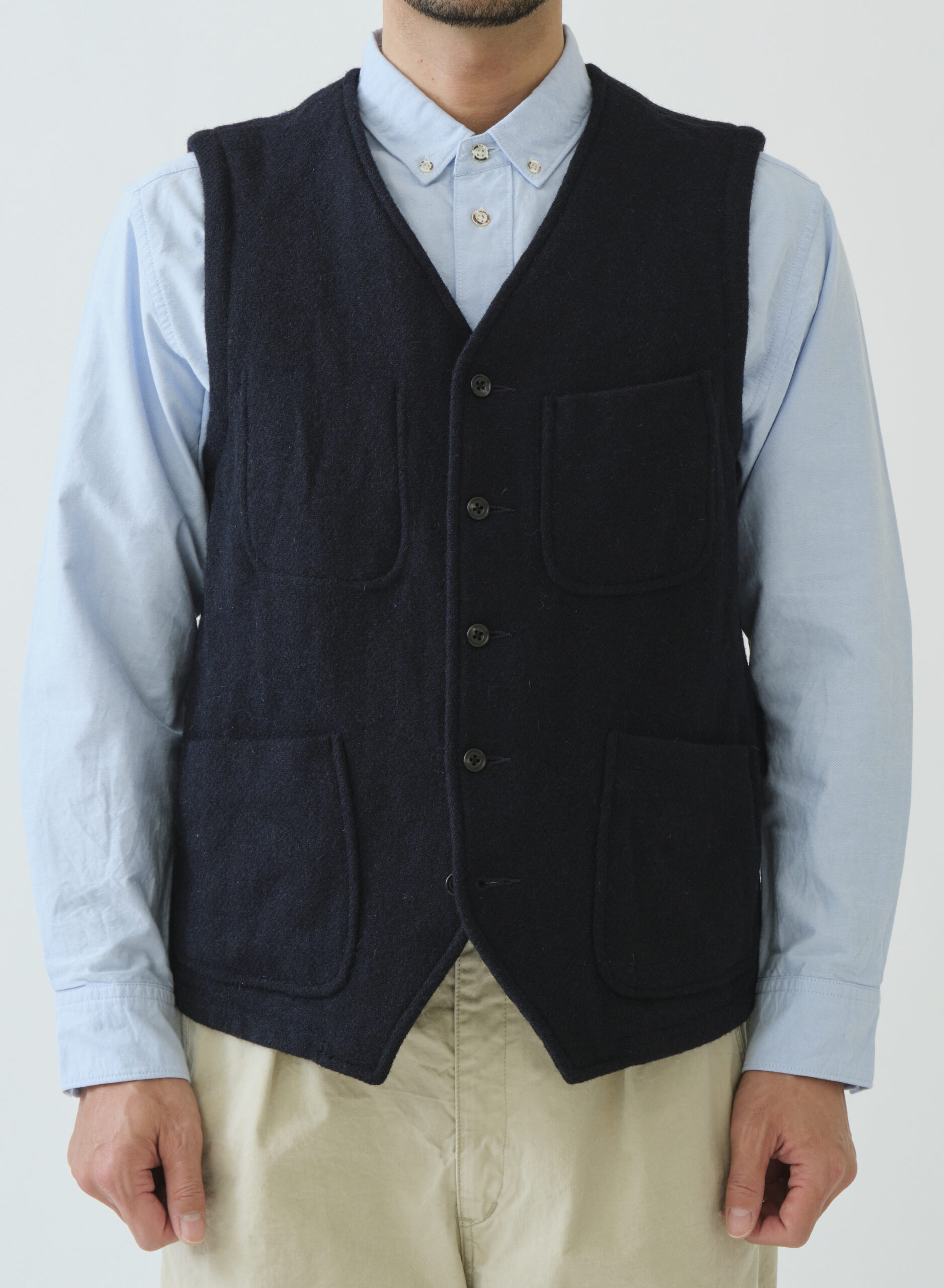 クラッシックなコンフォートスタイルのベスト。ワークタイプのポケットが特徴的で、上部の右側のみ裏に内ポケットが付く仕様。背面に調整用タブを備え、ウエスト周りのフィット感を調整できます。レイヤードの厚みに合わせてシルエットを整えられるため、着こなしの幅が広がります。ライトウェイトに仕上げるため、すべての縫い代をパイピングテープで処理。パイピングの生成りカラーがさりげないアクセントになっています。