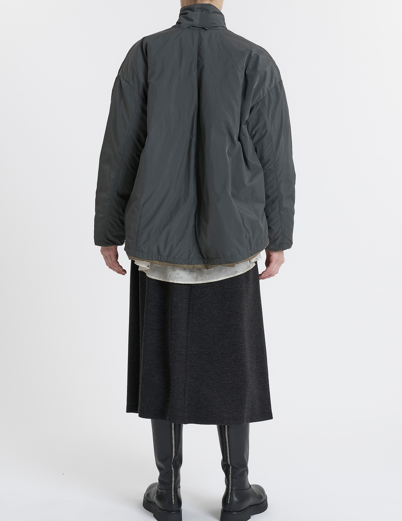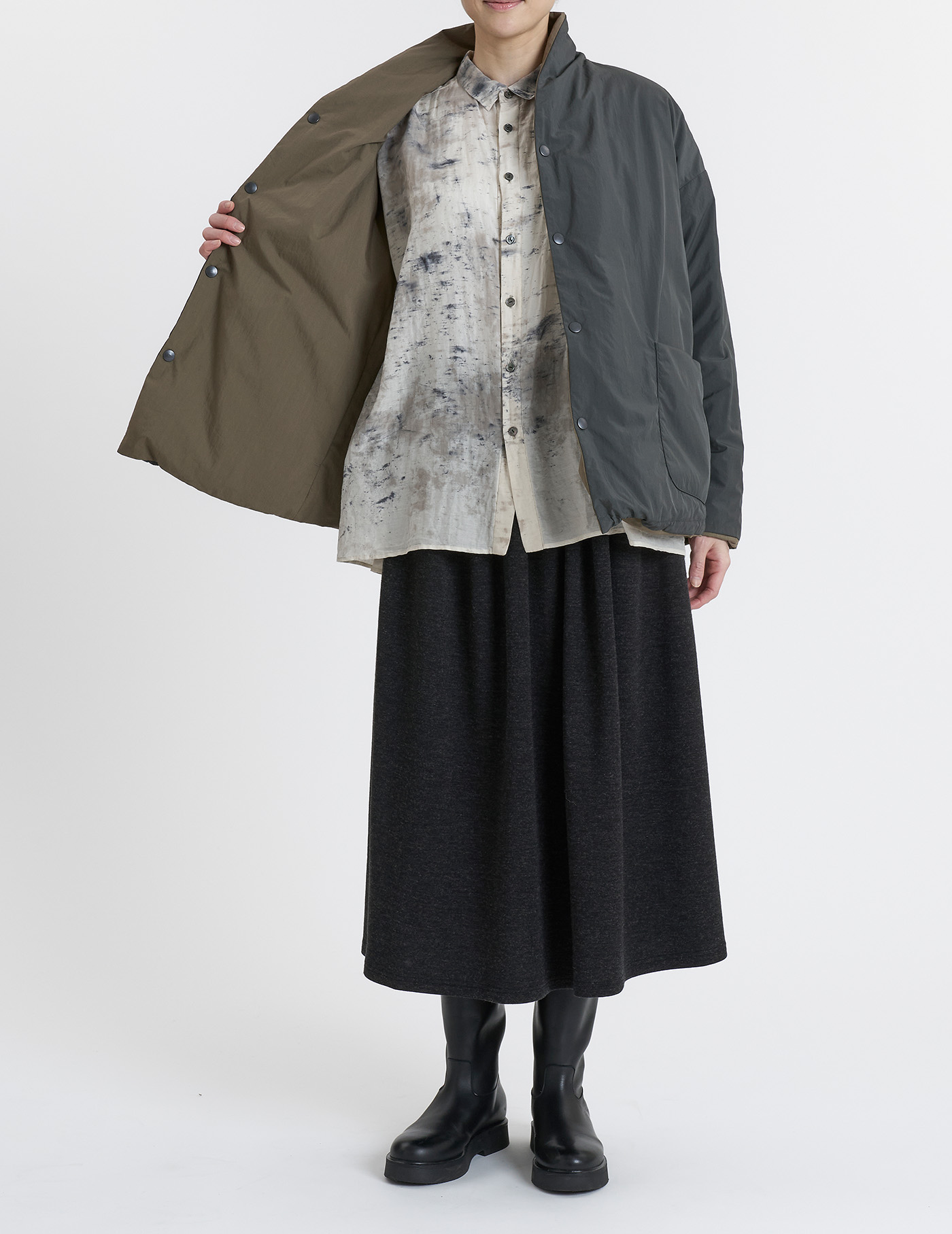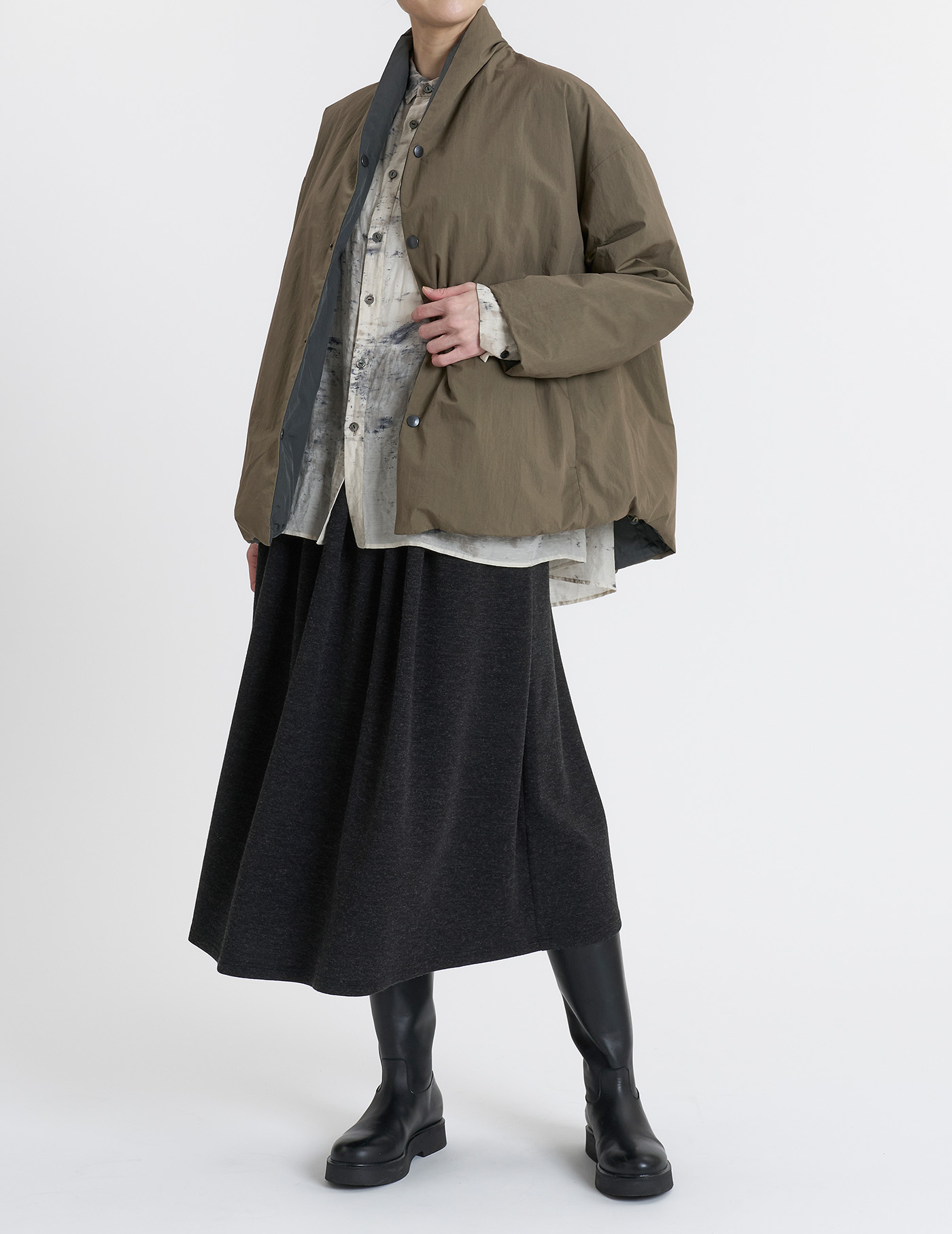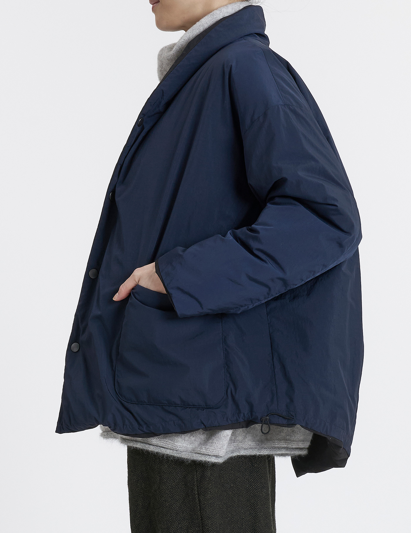 前立てはスナップボタン仕様で開閉がスムーズ、裾はドローストリングで表情を変えられるなど、