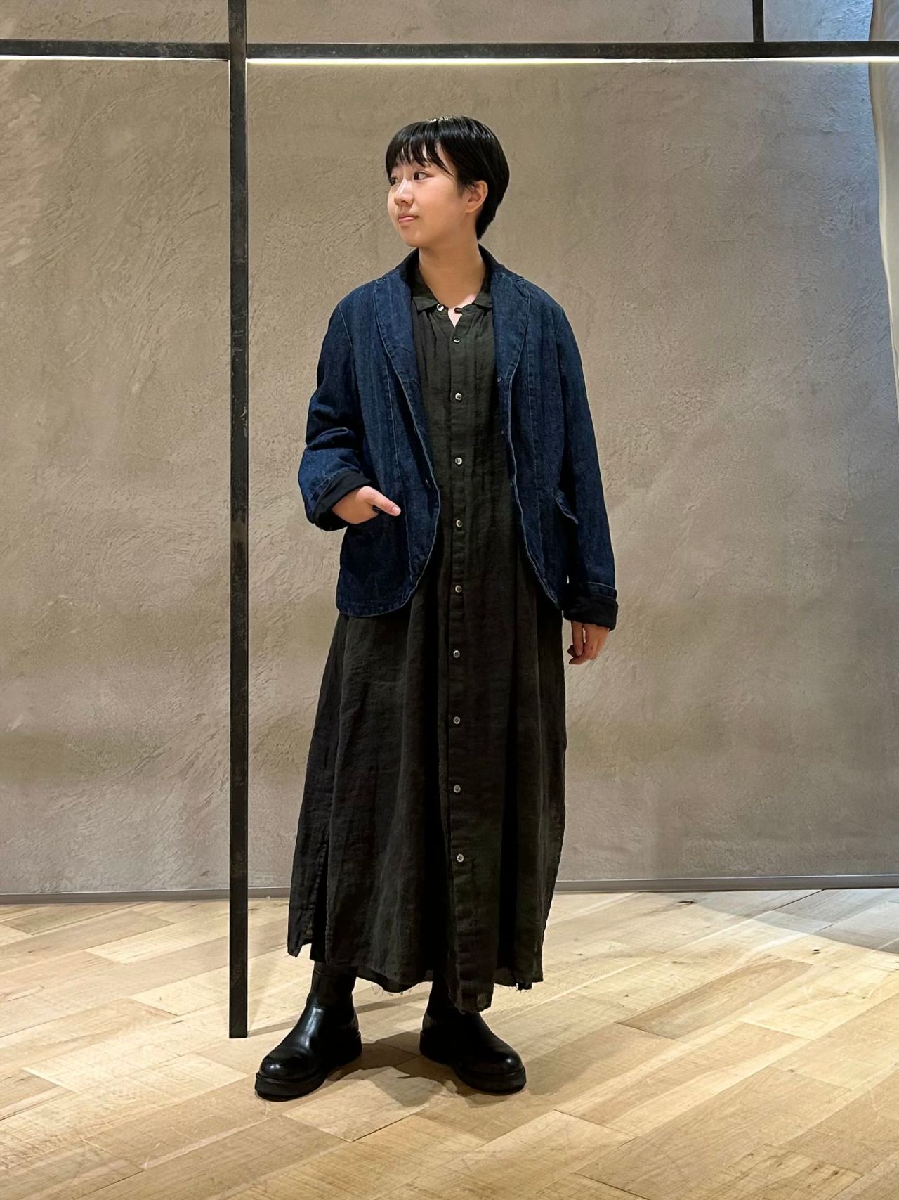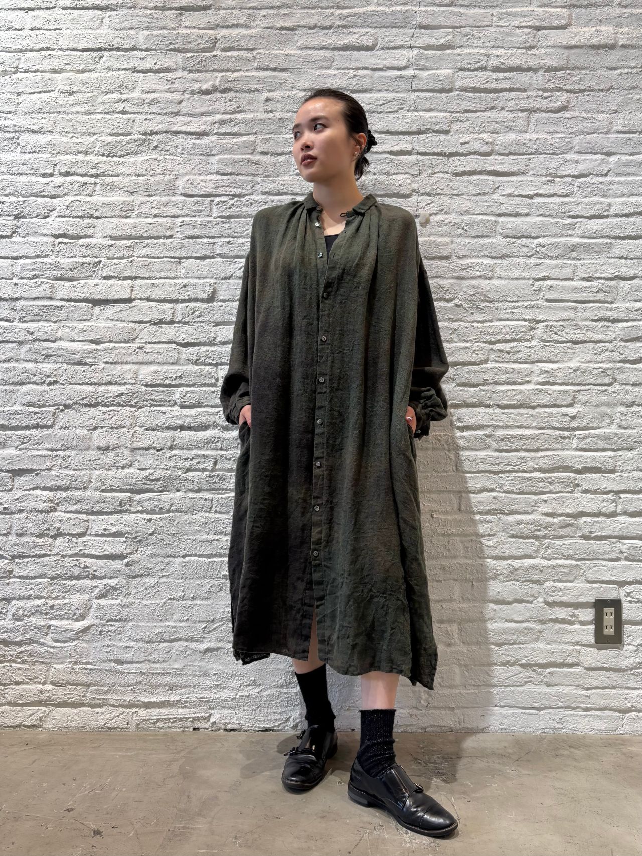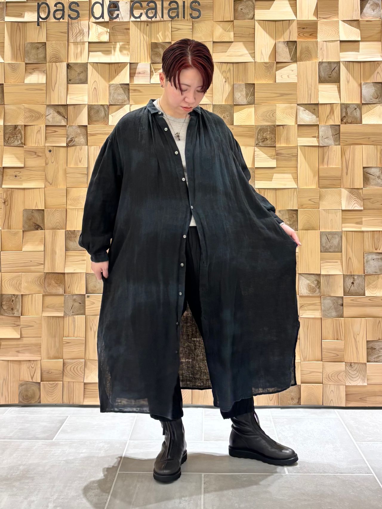前を閉めればワンピースとして中にパンツを履いたレイヤードスタイルにも、