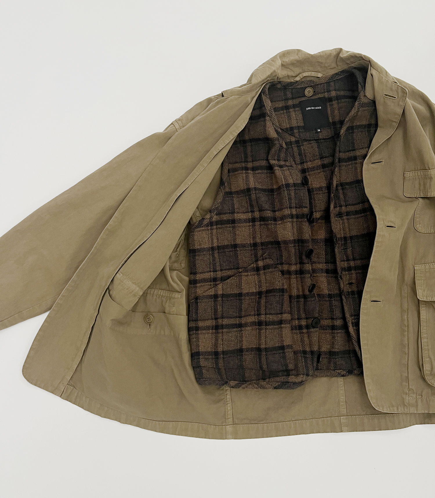 別々にして、無地のジャケット・チェック柄のベスト、それぞれでもコーディネート可能。