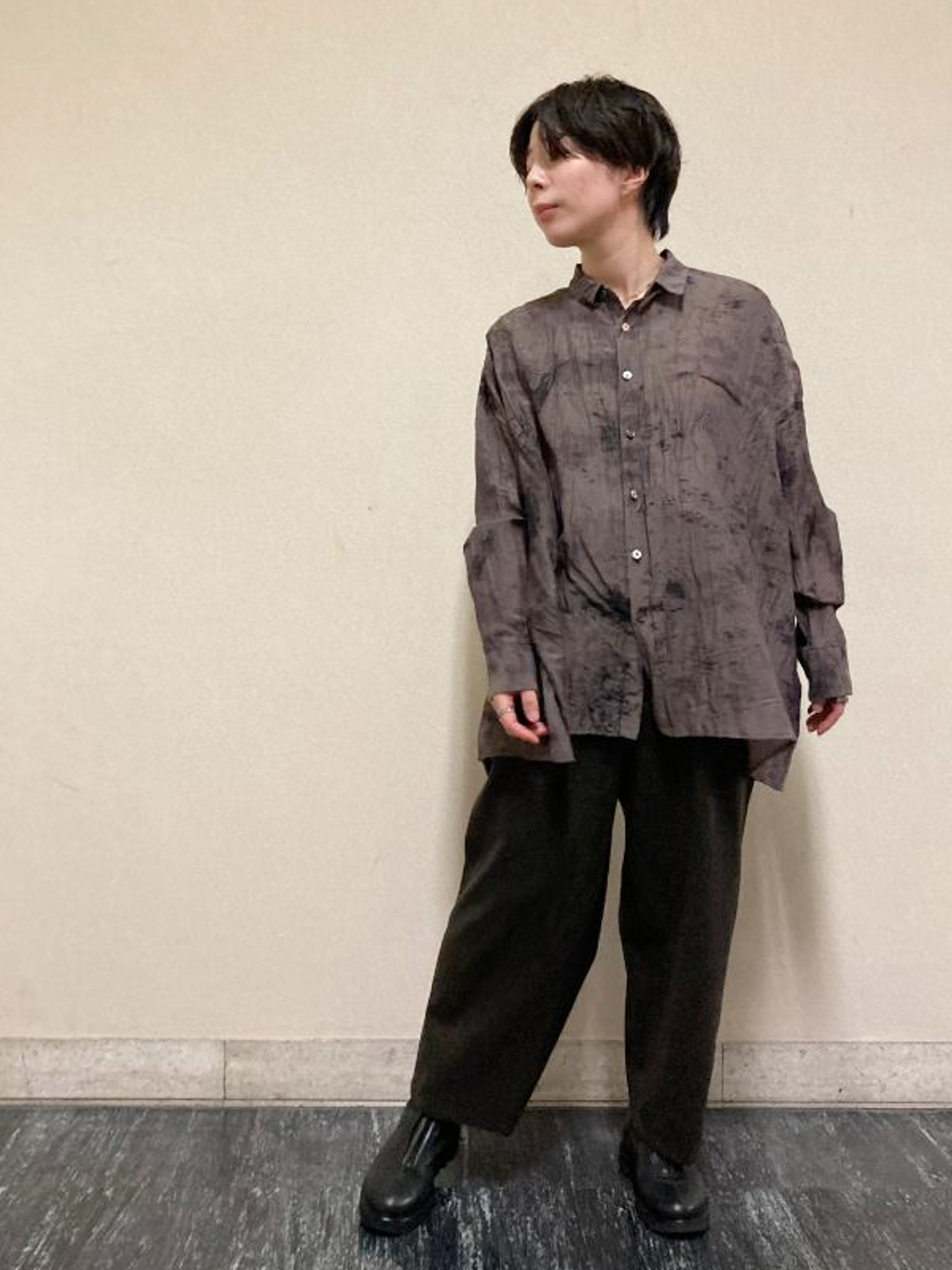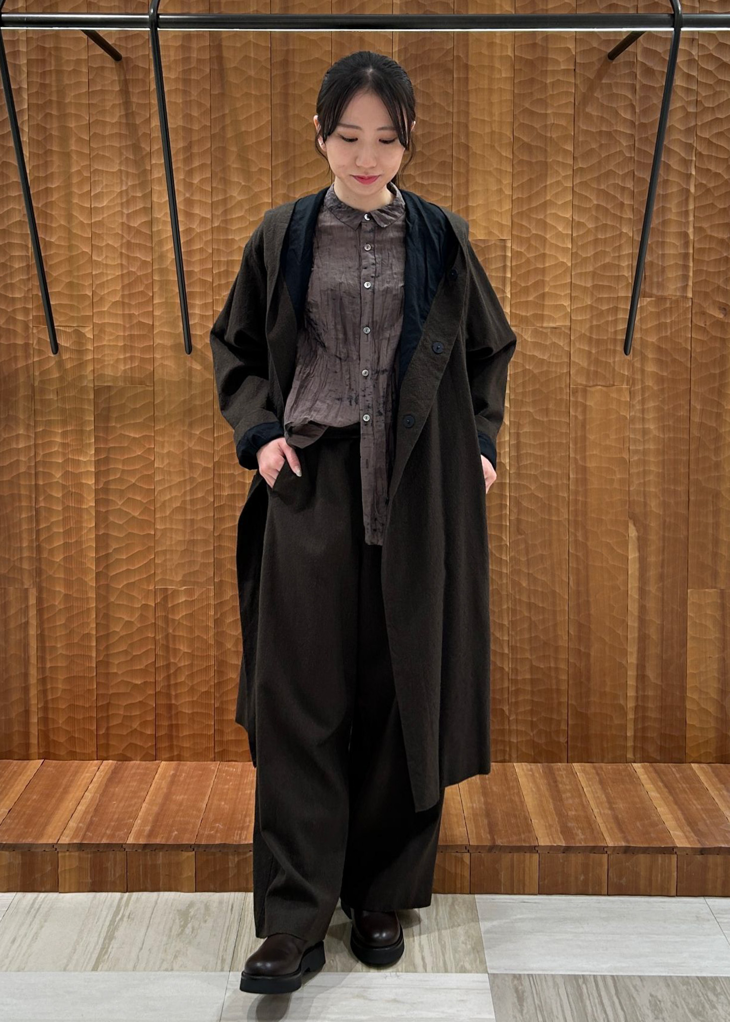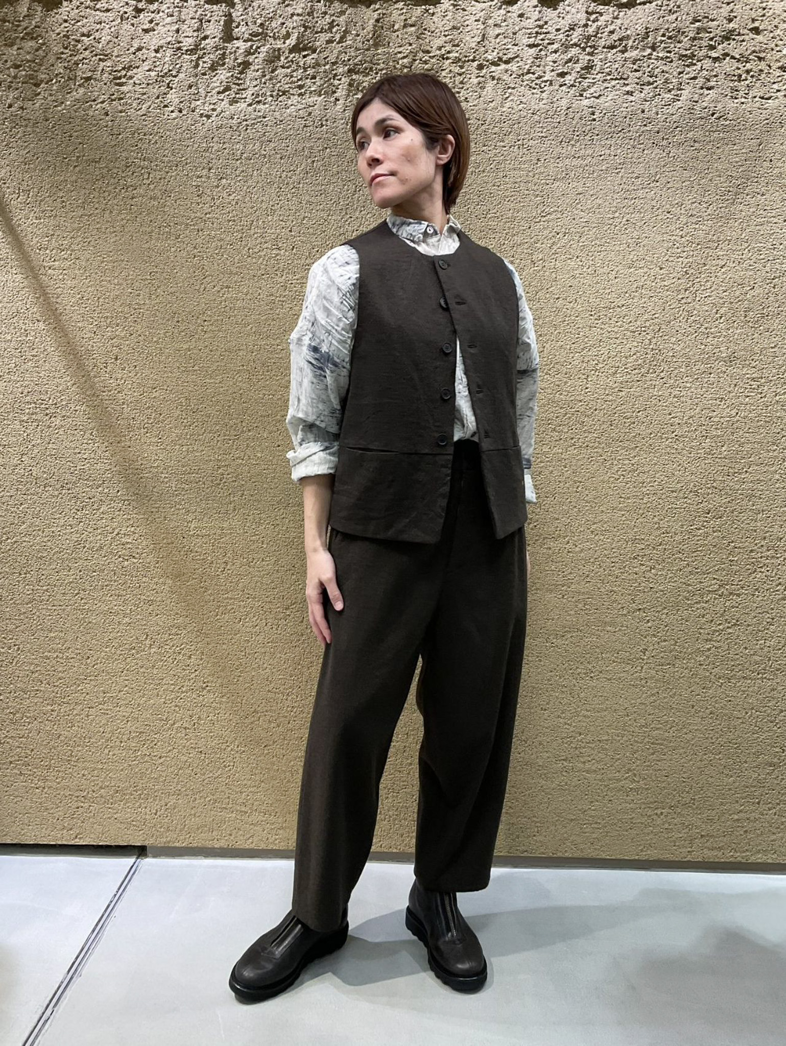 シーズンレスで着ていただける素材感なので、冬はレイヤードスタイルで。