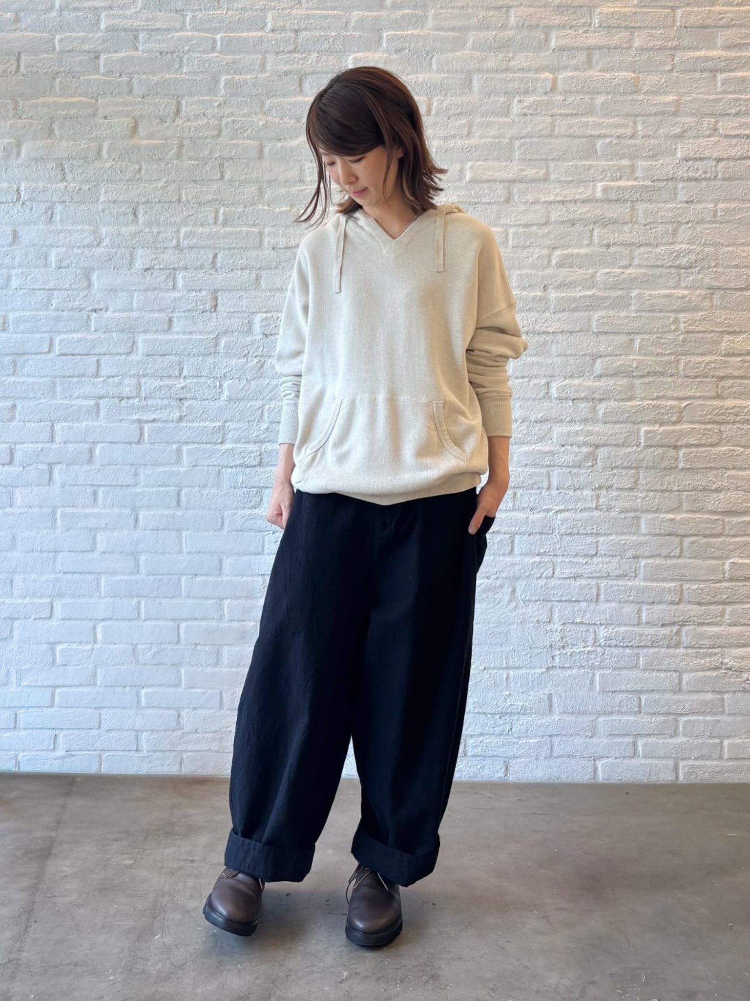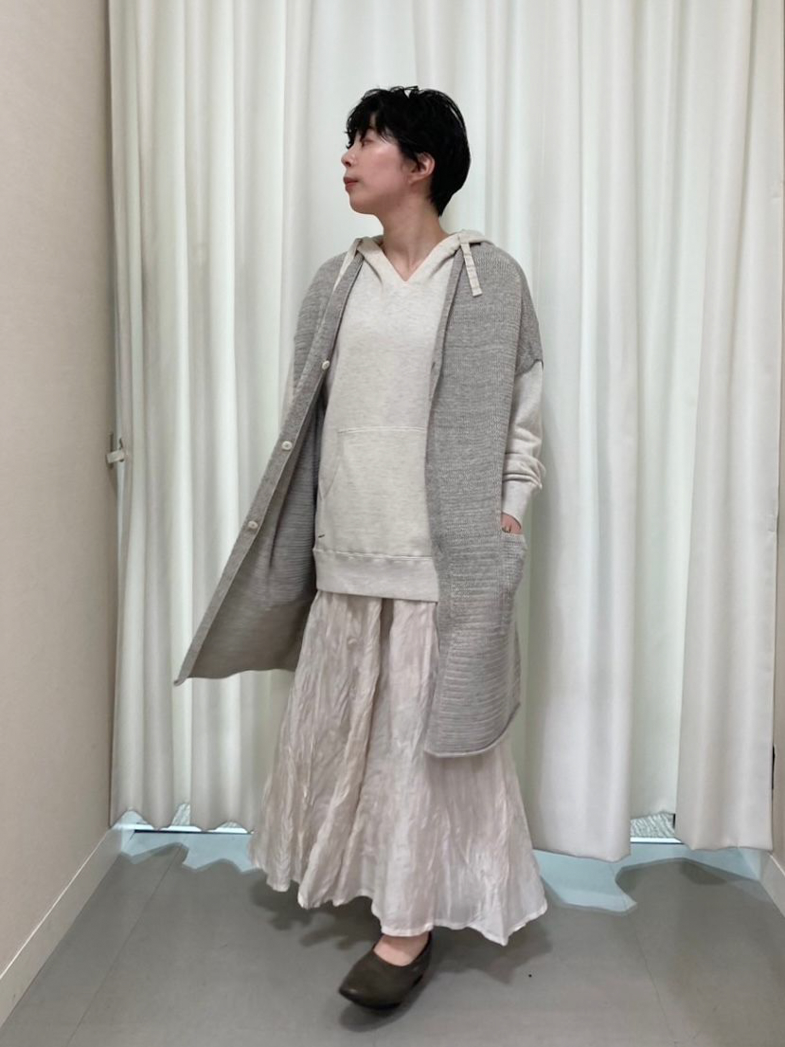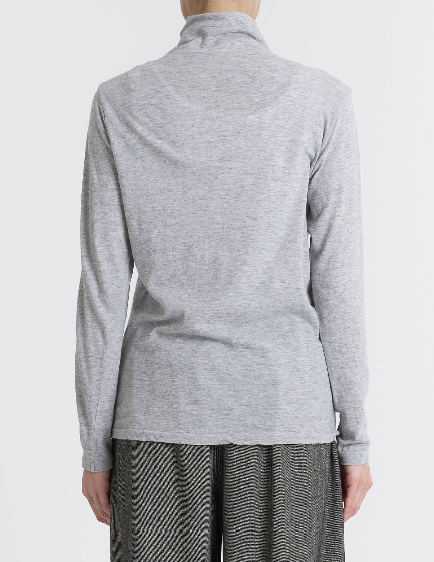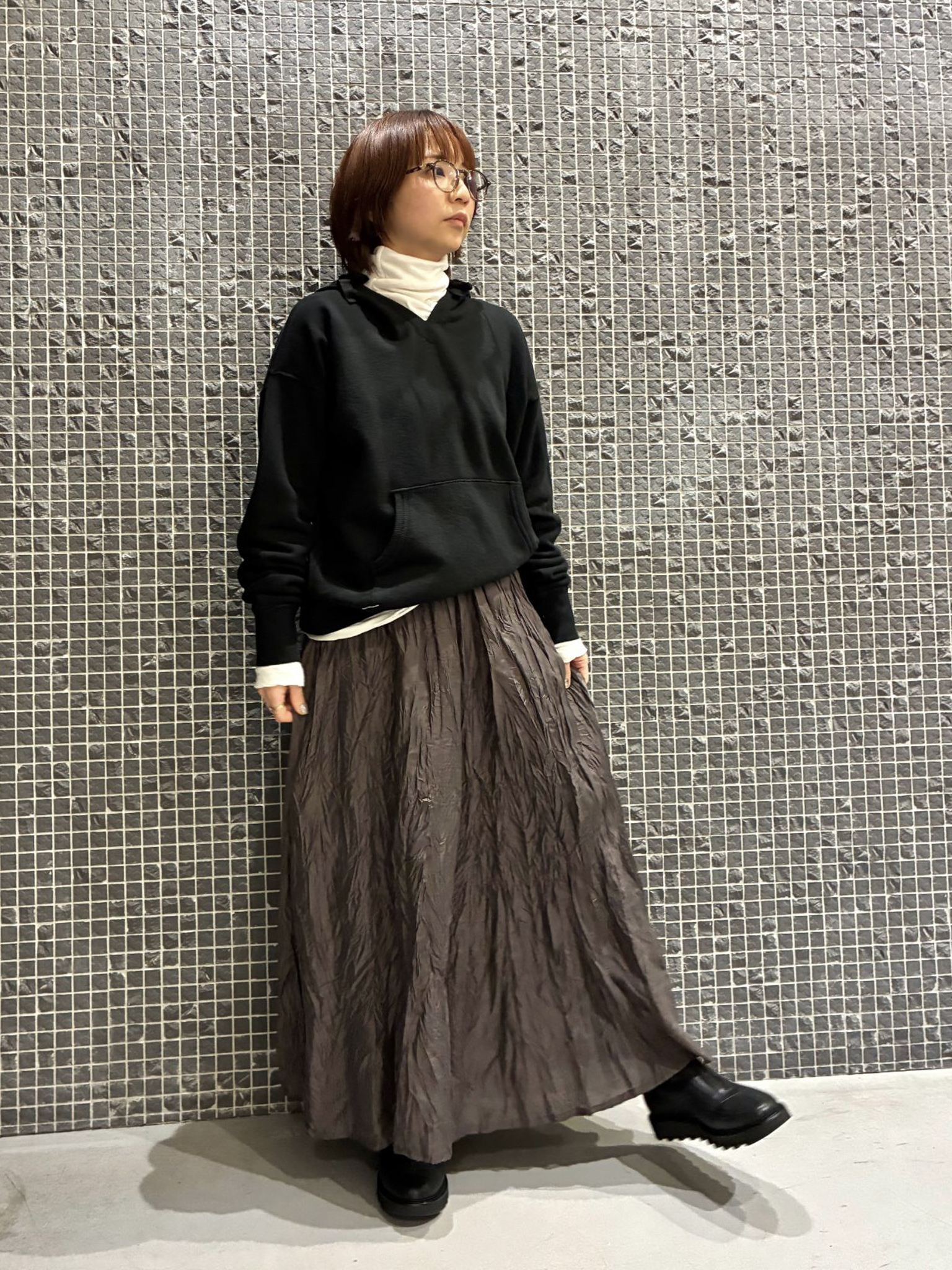 レイヤードスタイルをお楽しみいただけるようなネックラインなので、カットソータートルや、ブラウスを中に着ていただいても。