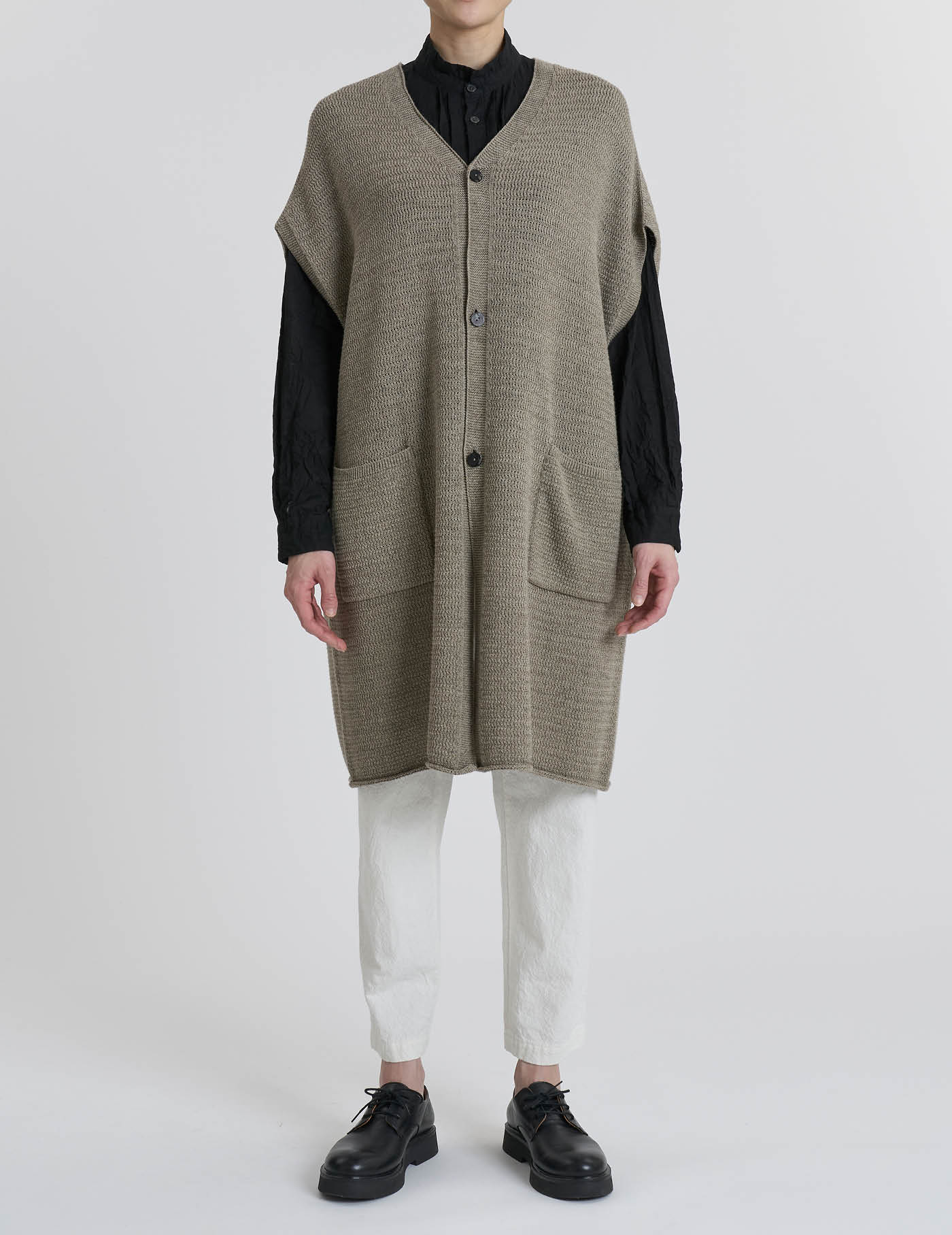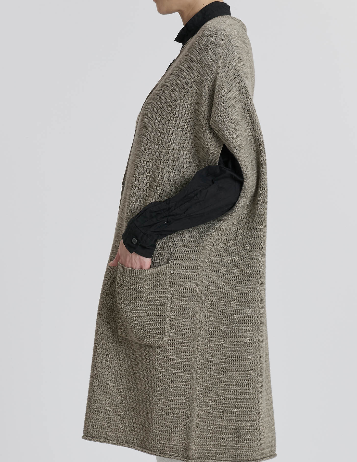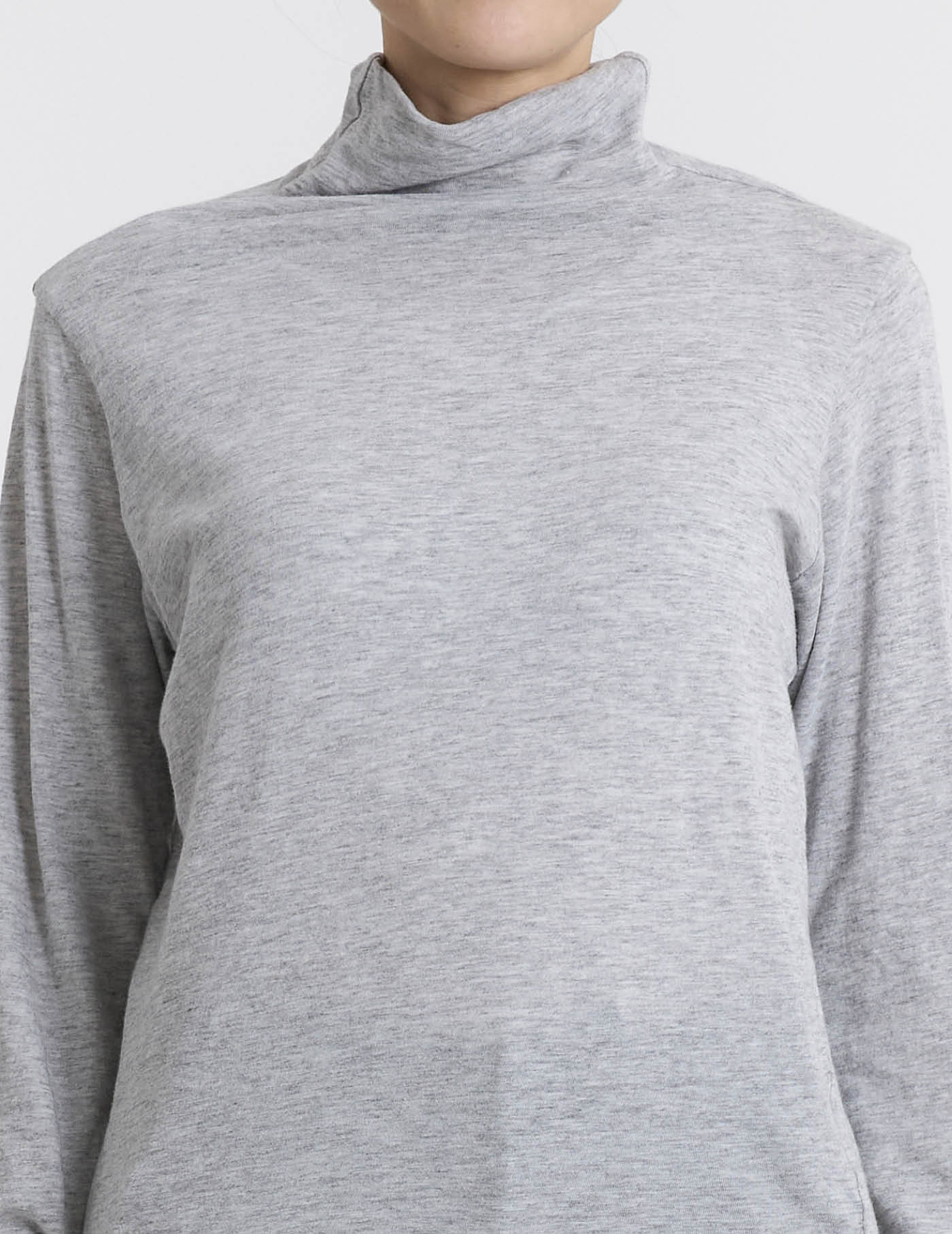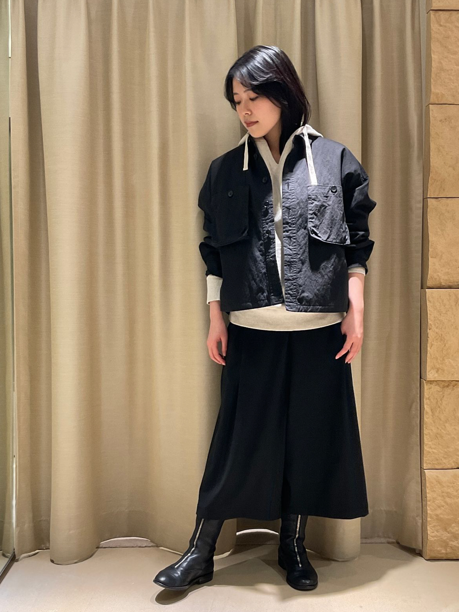 レイヤードスタイルをお楽しみいただけるようなネックラインなので、カットソータートルや、ブラウスを中に着ていただいても。