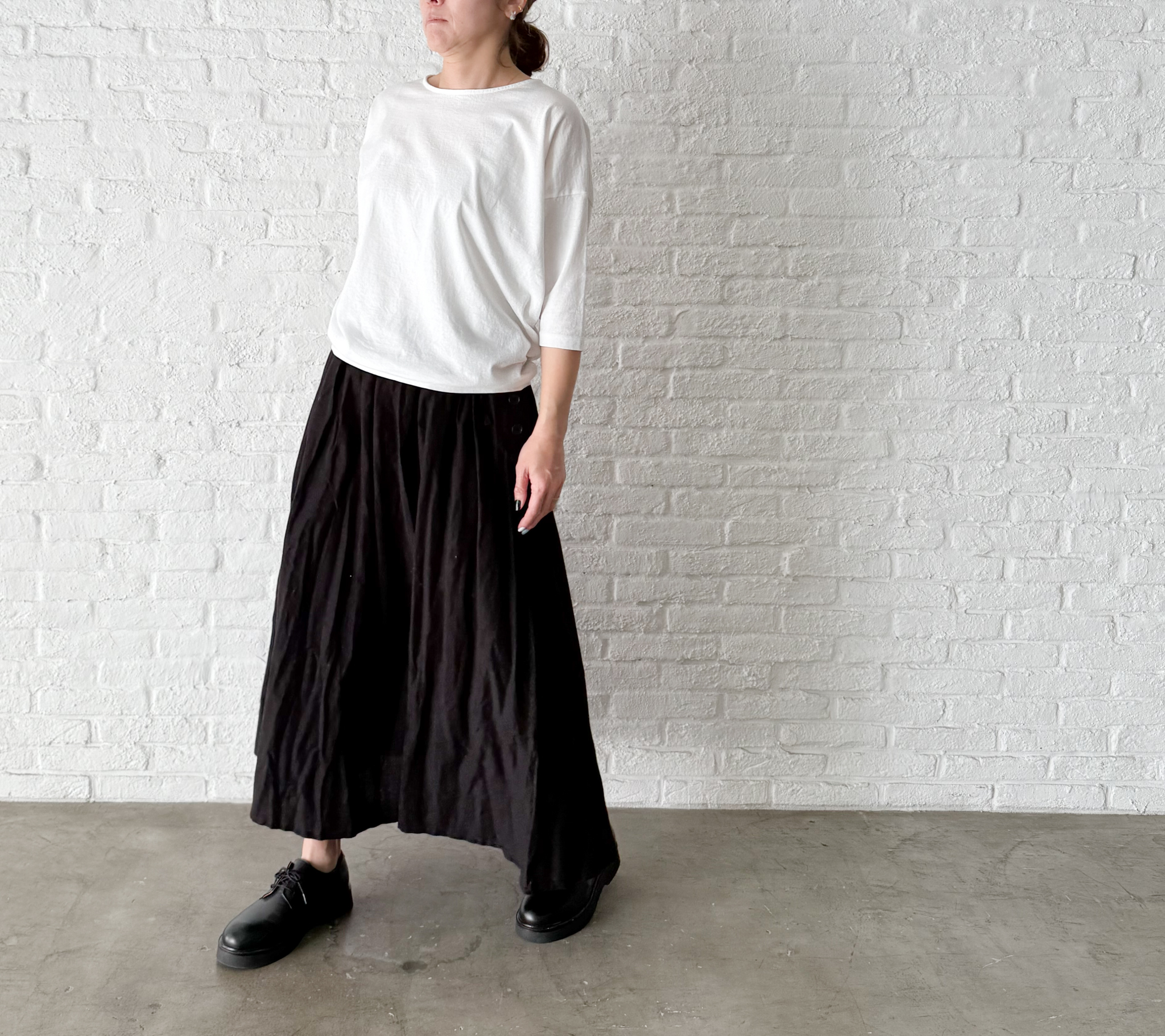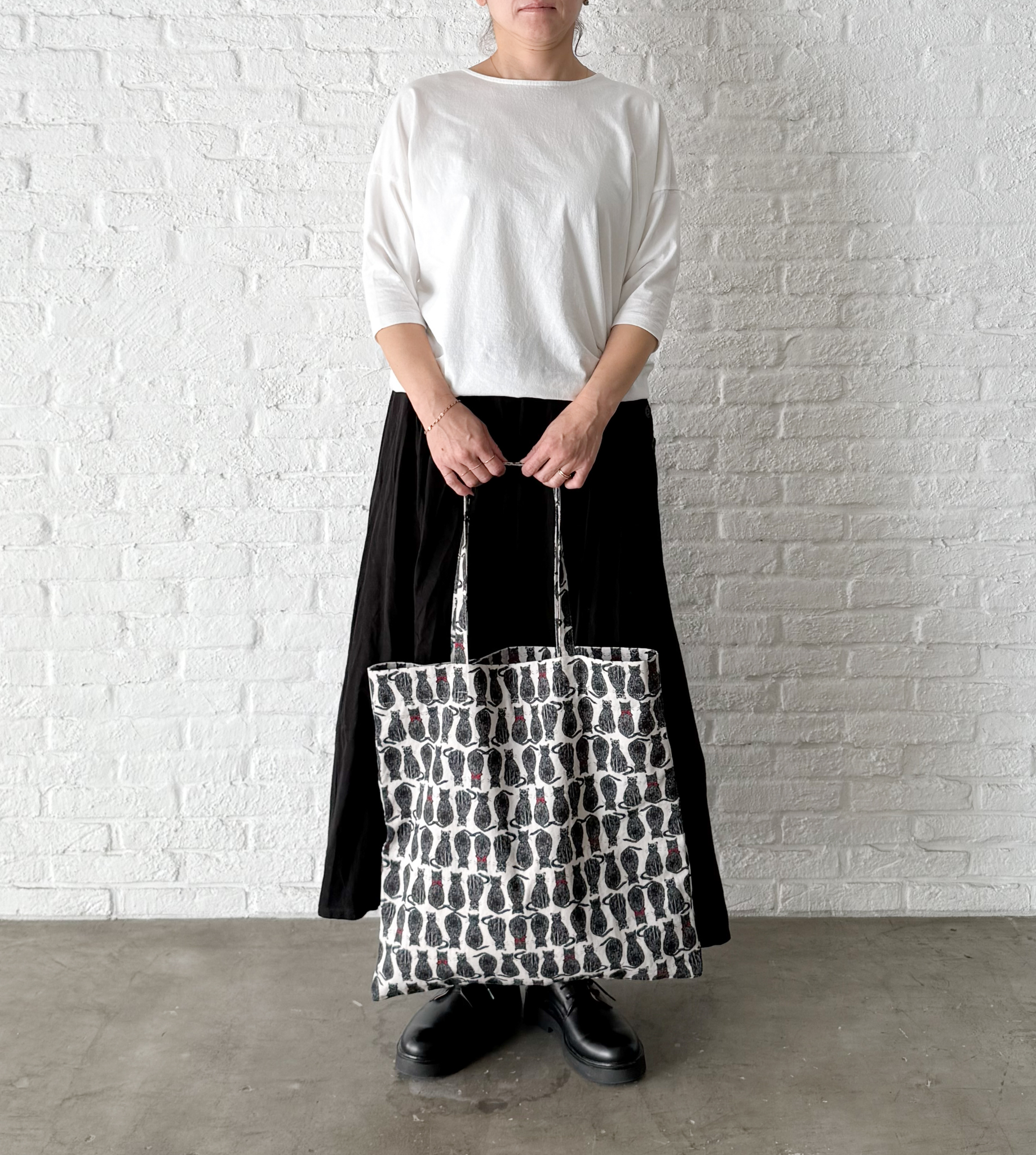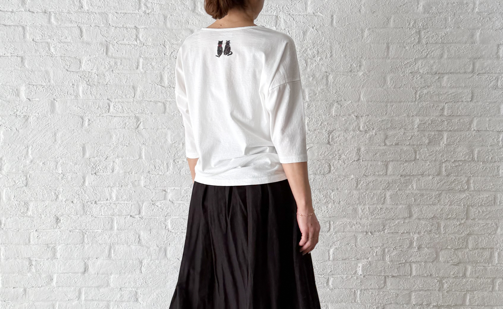 肩やバストまわりにゆったりとリラックス感をもたせた、プルオーバー。 ルーズになりすぎないよう、裾に向けすっきりとしたラインに仕上げました。 黒猫プリントを後ろのネックラインにさりげなく入れて、デイリーに使いやすいデザインに。